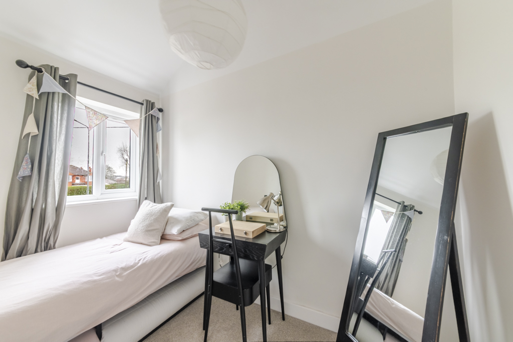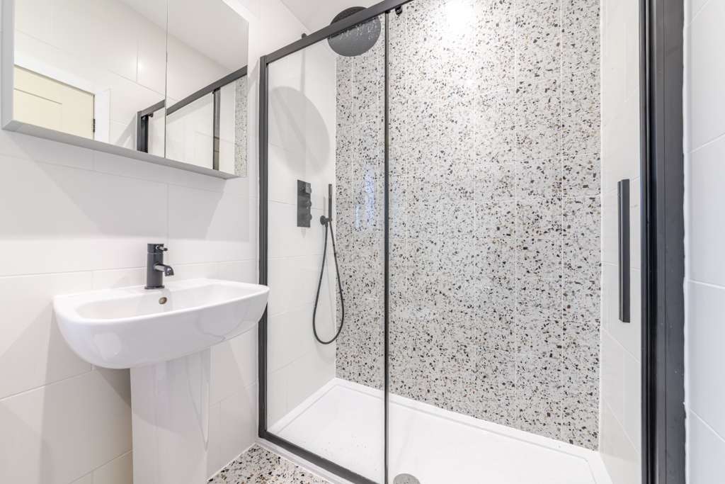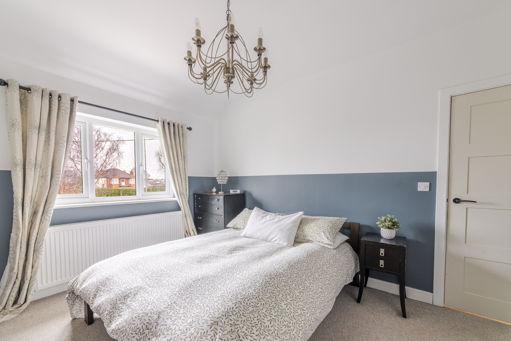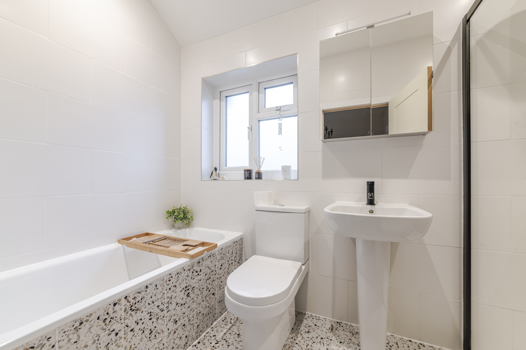 To the first floor, the bathroom is a standout feature, fitted with both a bath and a generously sized walk in shower. There are three bedrooms, including a spacious and bright principal bedroom, a comfortable second bedroom and a third bedroom which benefits from high ceilings and an exposed beam, adding character and charm.