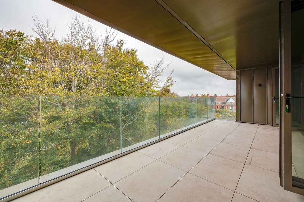 The two double bedrooms continue the sense of light and calm. The principal bedroom features full-height glazing and a beautifully appointed en-suite. Designer Porcelanosa tiles, sensor-activated LED mirrors and heated towel rails bring a spa-like indulgence to every day. A second bathroom, finished to the same impeccable standard, ensures comfort for guests or family.