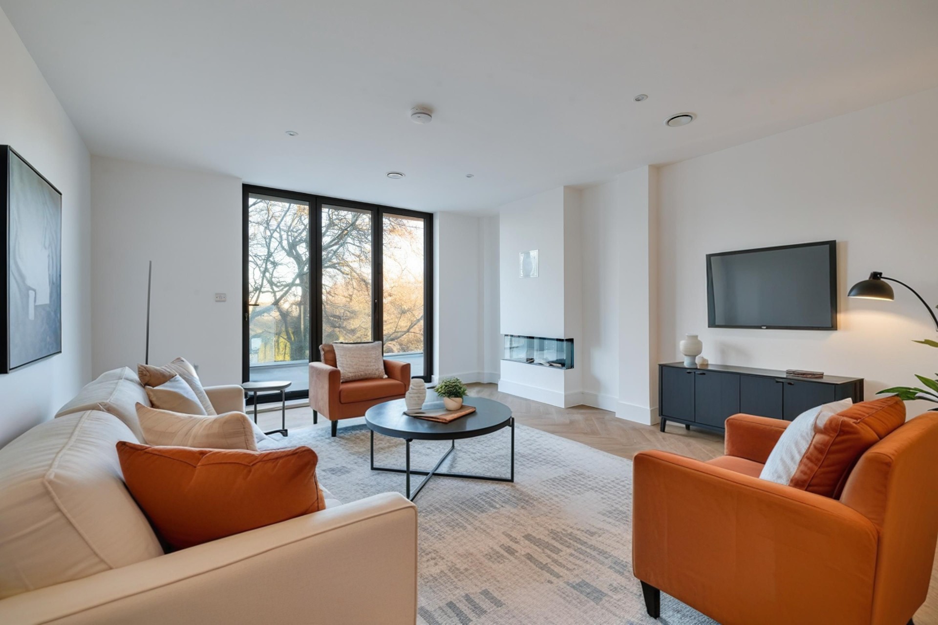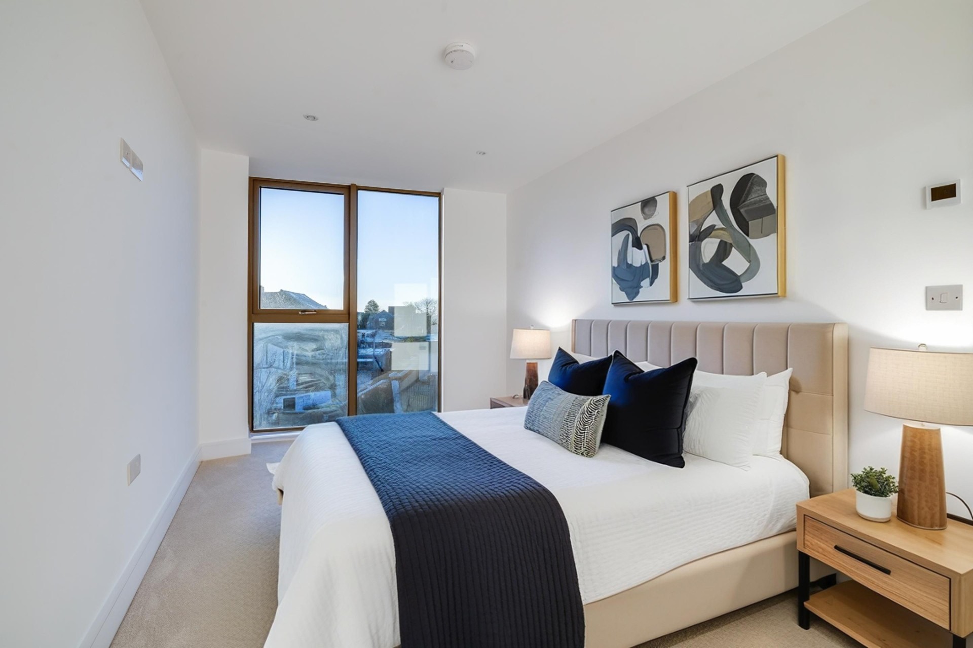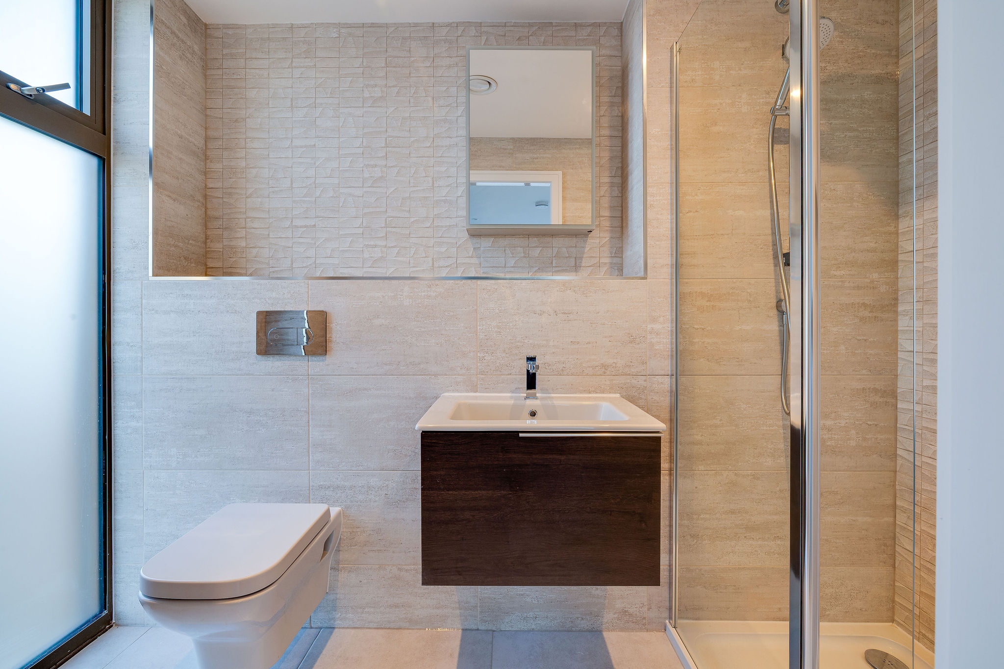 The two double bedrooms continue the sense of light and calm. The principal bedroom features full-height glazing, a walk-in wardrobe and a beautifully appointed en-suite. Designer Porcelanosa tiles, sensor-activated LED mirrors and heated towel rails bring a spa-like indulgence to every day. A second bathroom, finished to the same impeccable standard, ensures comfort for guests or family.