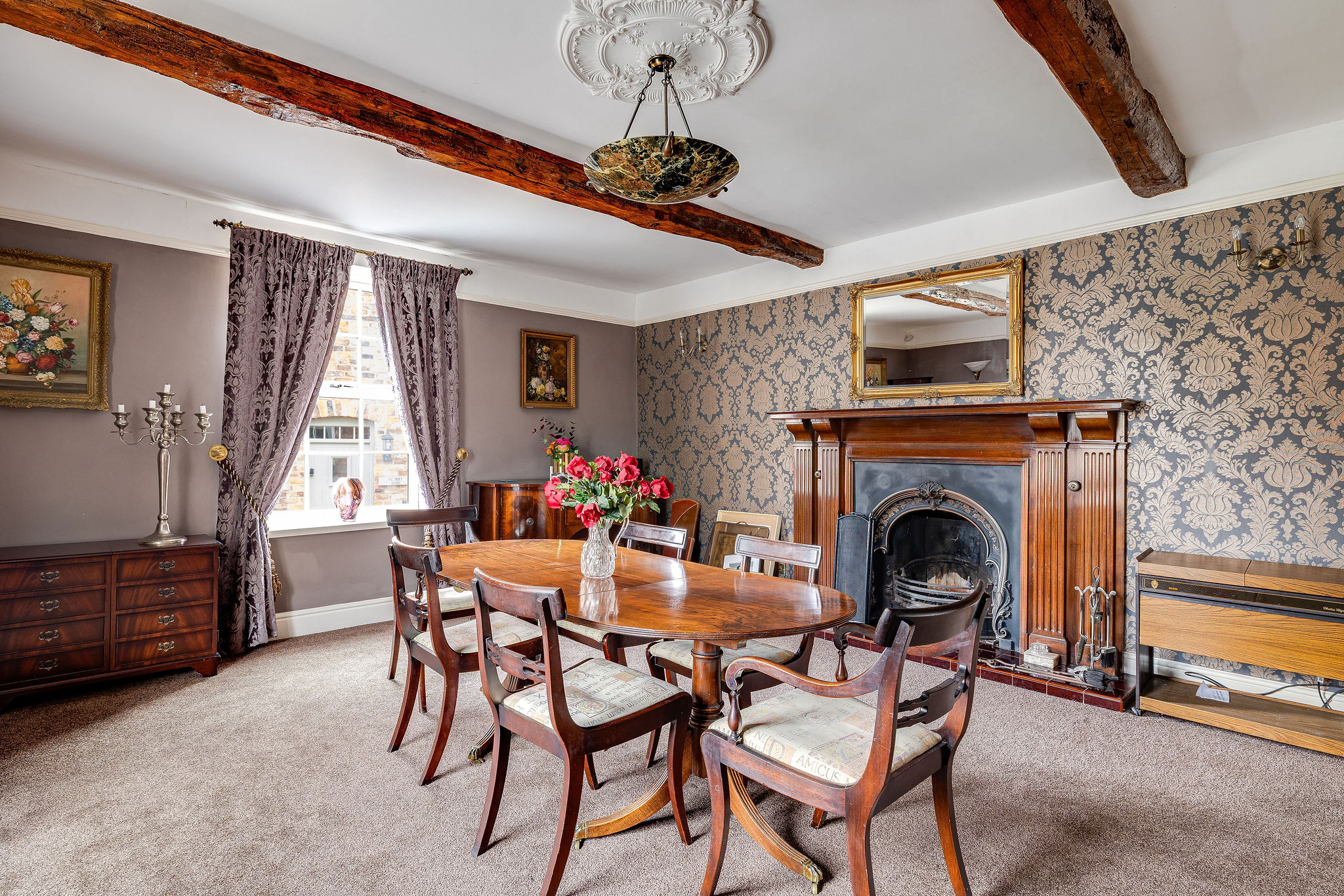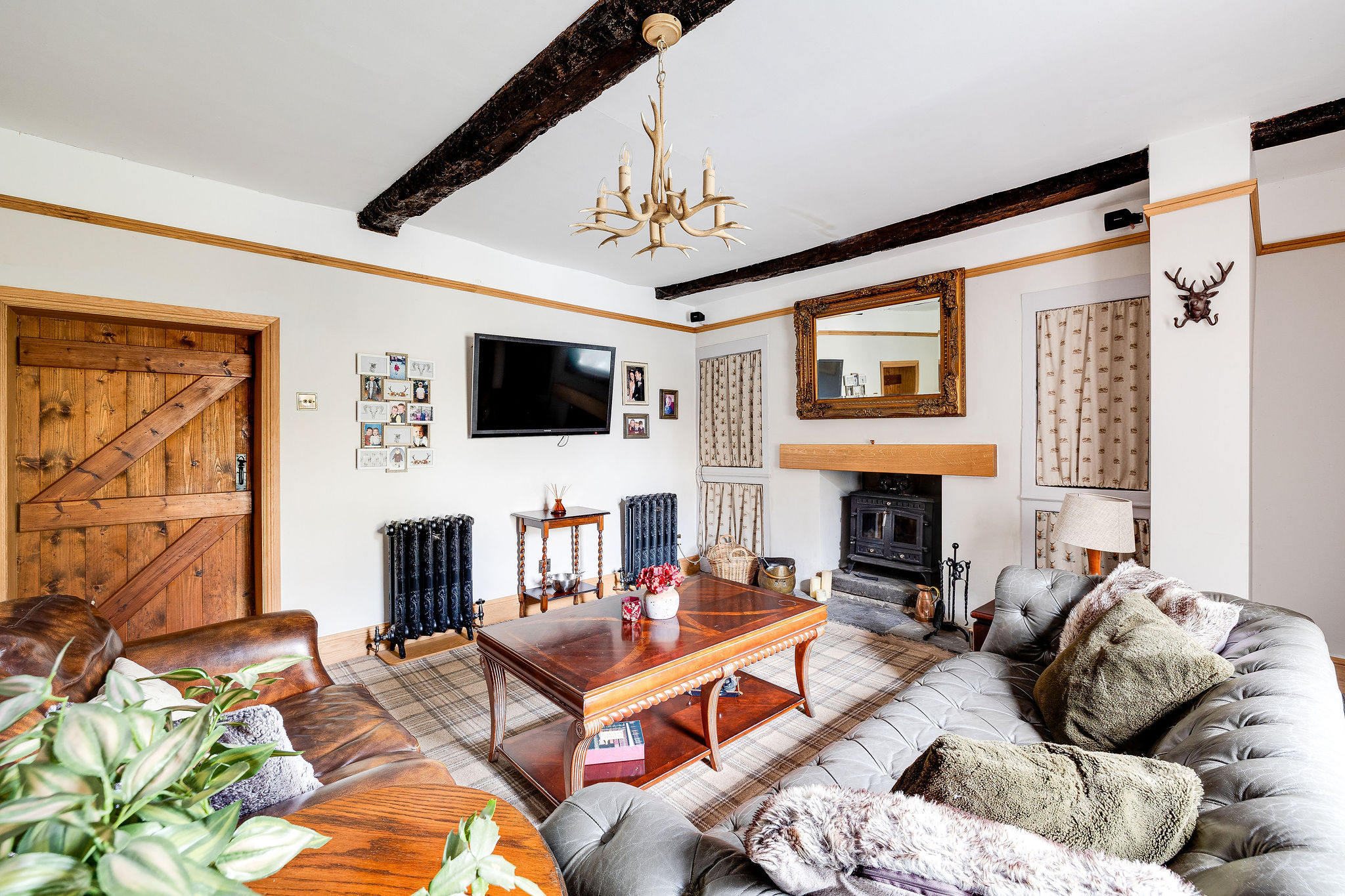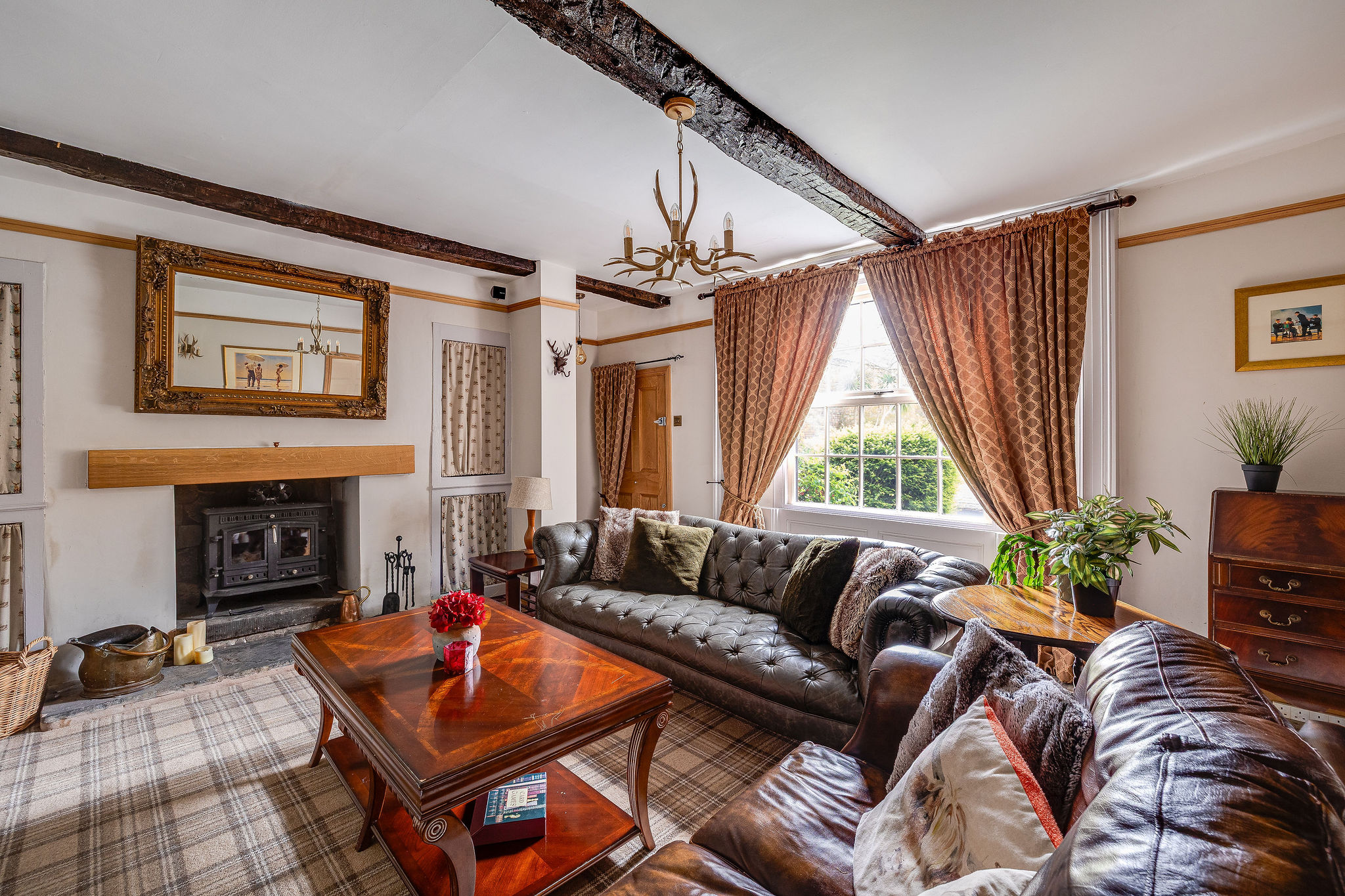 The kitchen is full of character, with exposed beams, a pantry and direct access outside, while the adjoining reception areas provide excellent flexibility for both formal and informal living. There is a relaxed sitting room positioned close to the kitchen, ideal for day to day family life, as well as a stunning principal lounge with log burning stove and a separate formal dining room with impressive ceiling height and open fireplace. A ground floor WC adds further convenience.