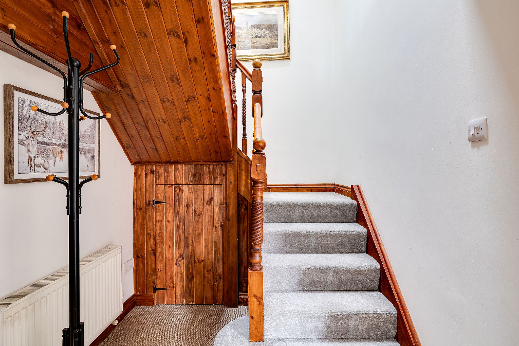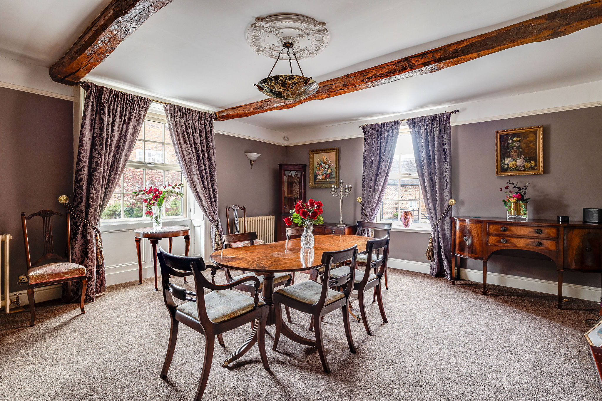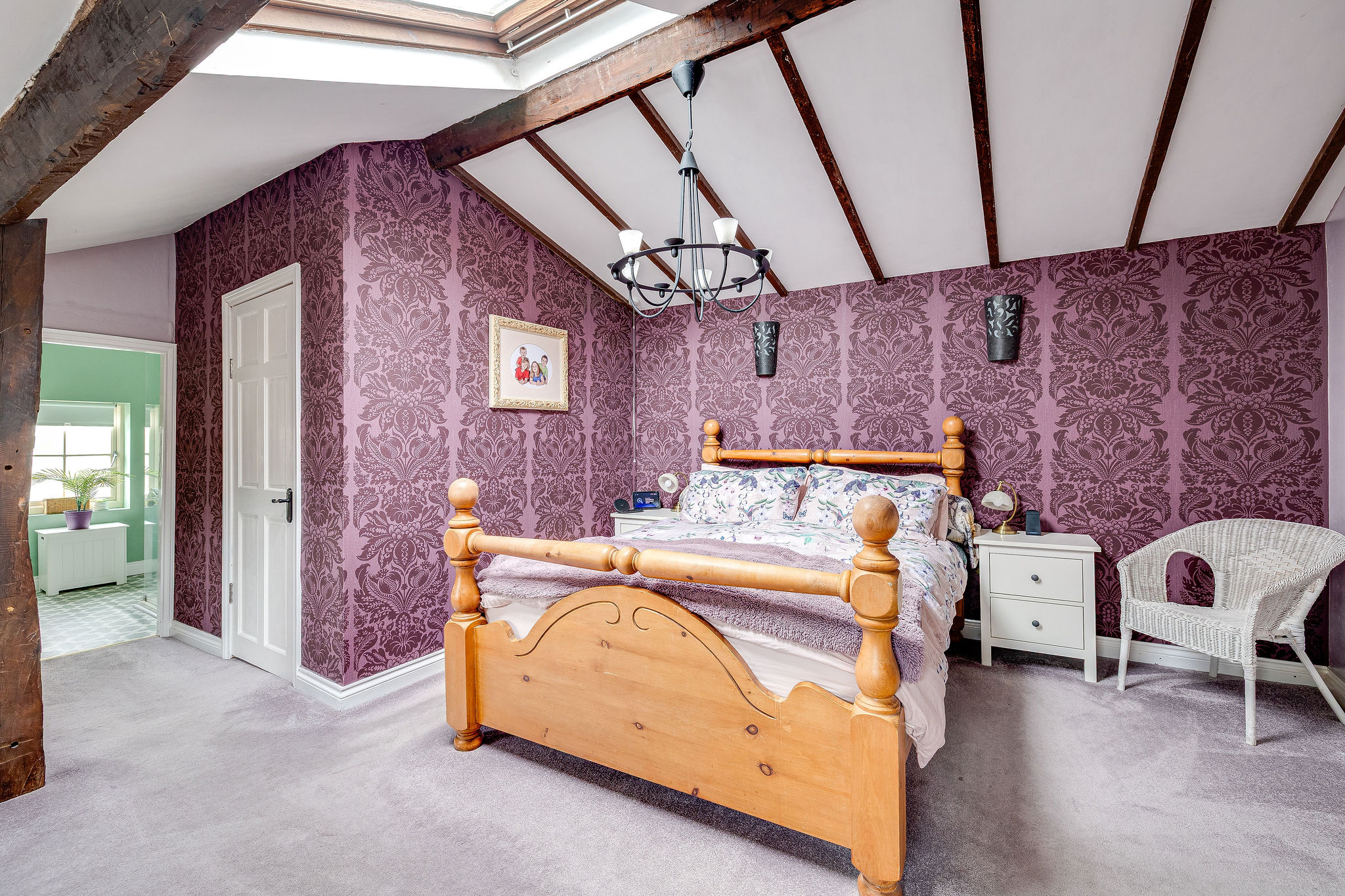 The kitchen is full of character, with exposed beams, a pantry and direct access outside, while the adjoining reception areas provide excellent flexibility for both formal and informal living. There is a relaxed sitting room positioned close to the kitchen, ideal for day to day family life, as well as a stunning principal lounge with log burning stove and a separate formal dining room with impressive ceiling height and open fireplace. A ground floor WC adds further convenience.