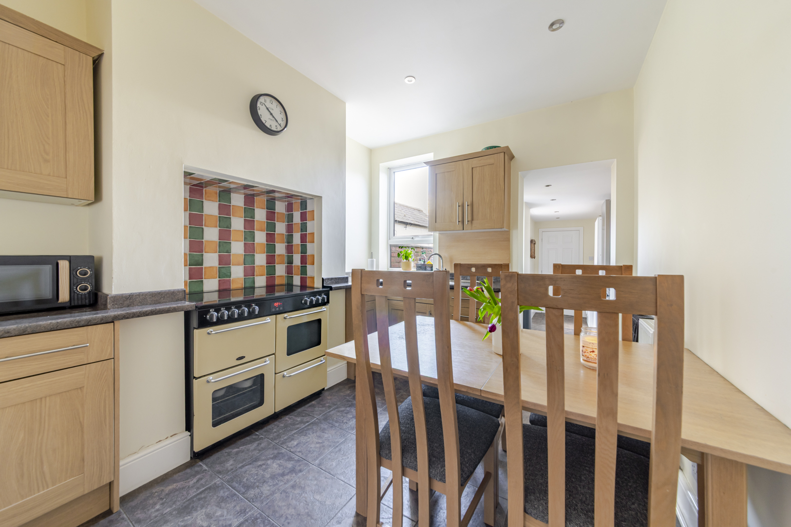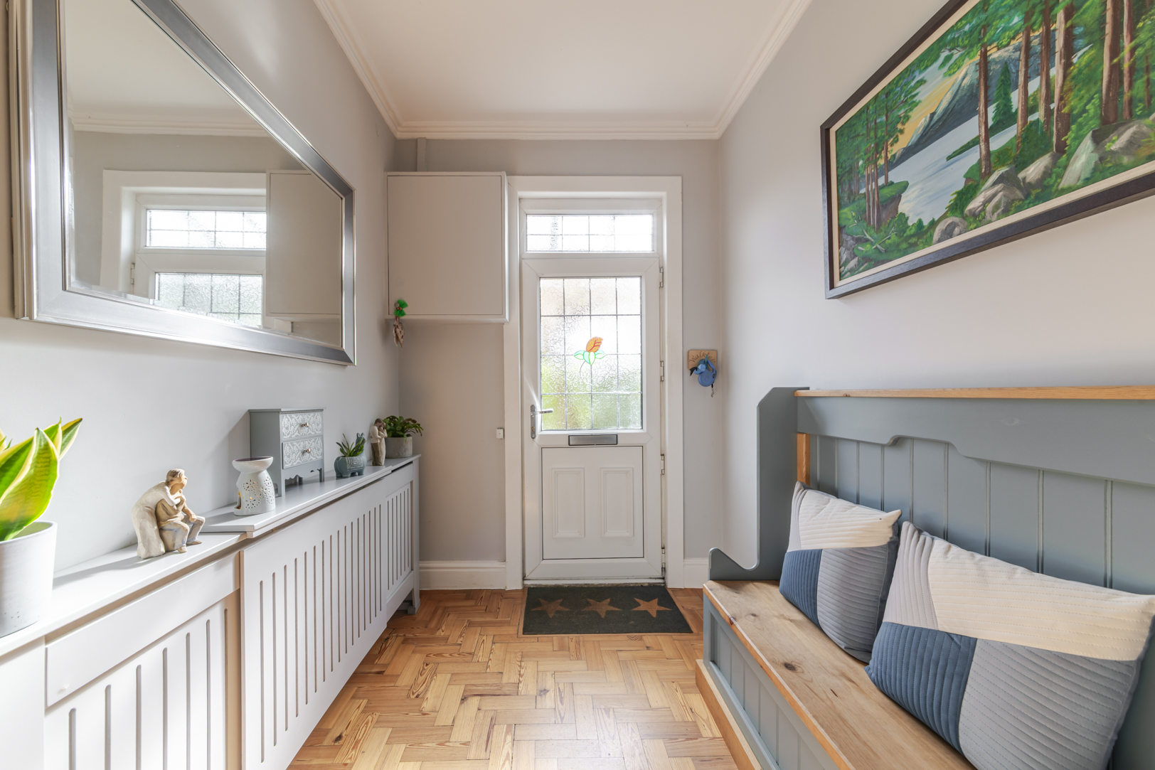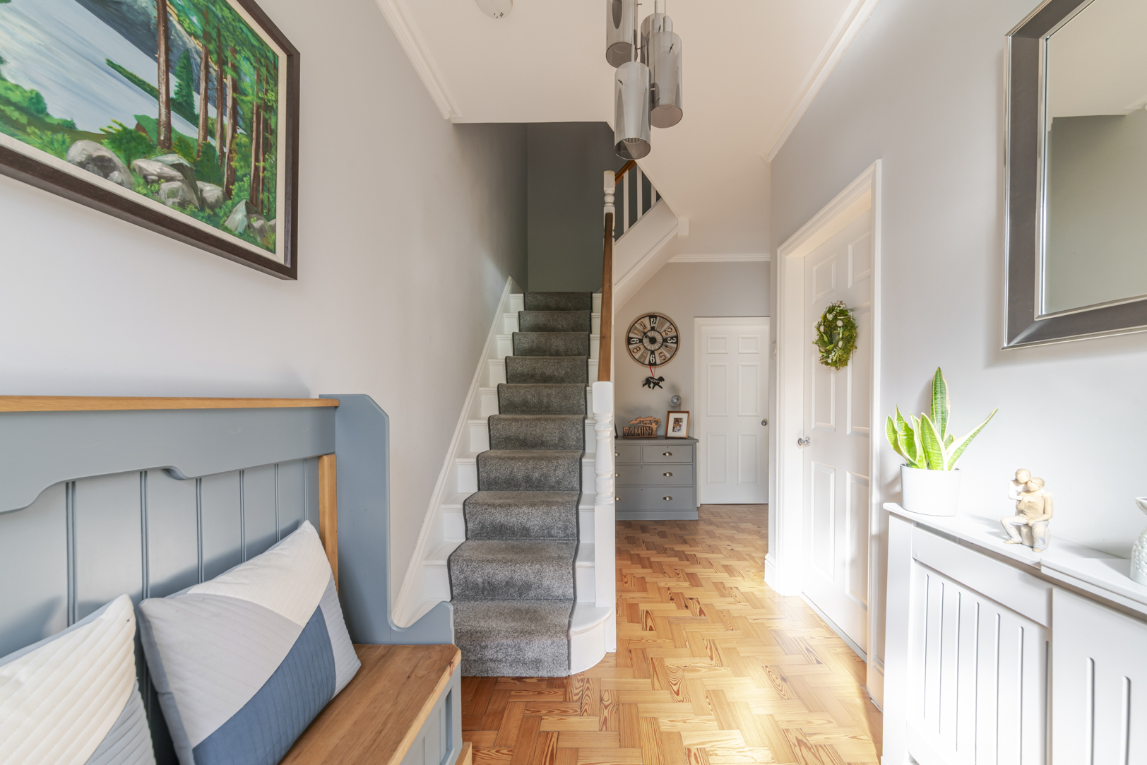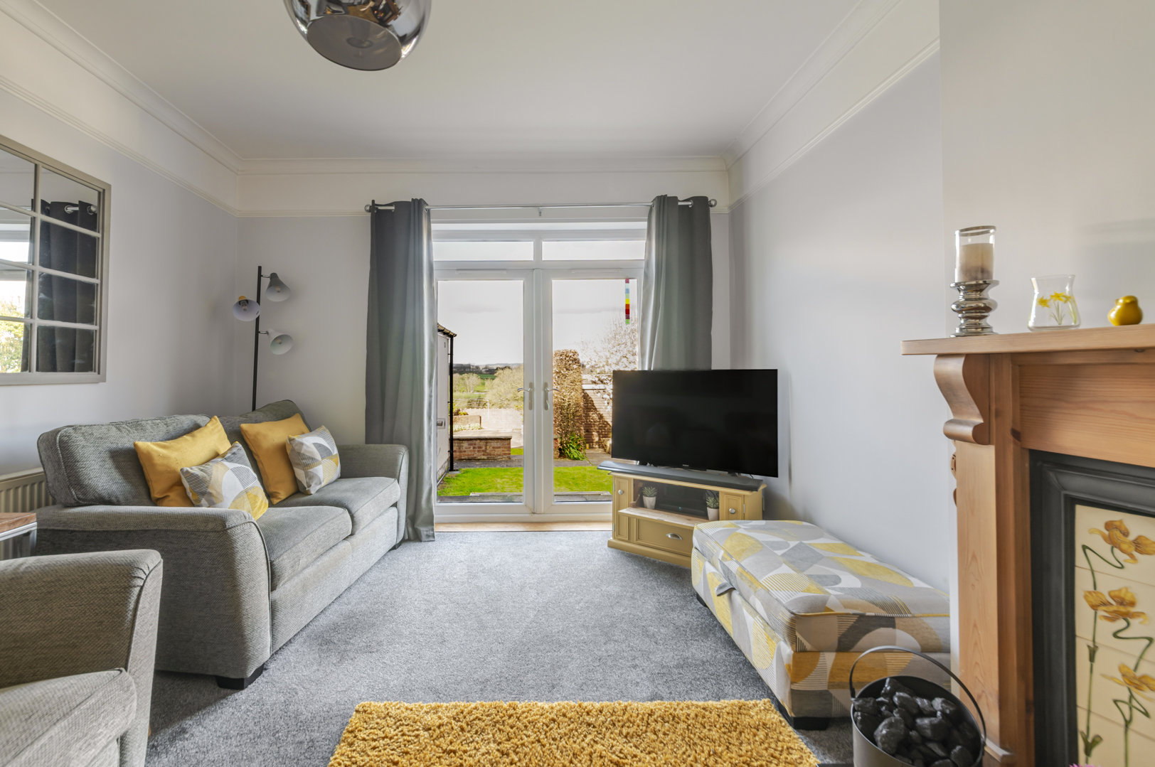 Internally, the home immediately impresses with a spacious and welcoming entrance hall, setting the tone for the accommodation throughout. To the front, a beautifully proportioned reception room featuring a bay window and fireplace is currently used as a dining room, though it offers flexibility to suit a variety of uses. To the rear, a second reception room provides a cosy living space, complete with patio doors opening onto the garden and enjoying far-reaching views.
