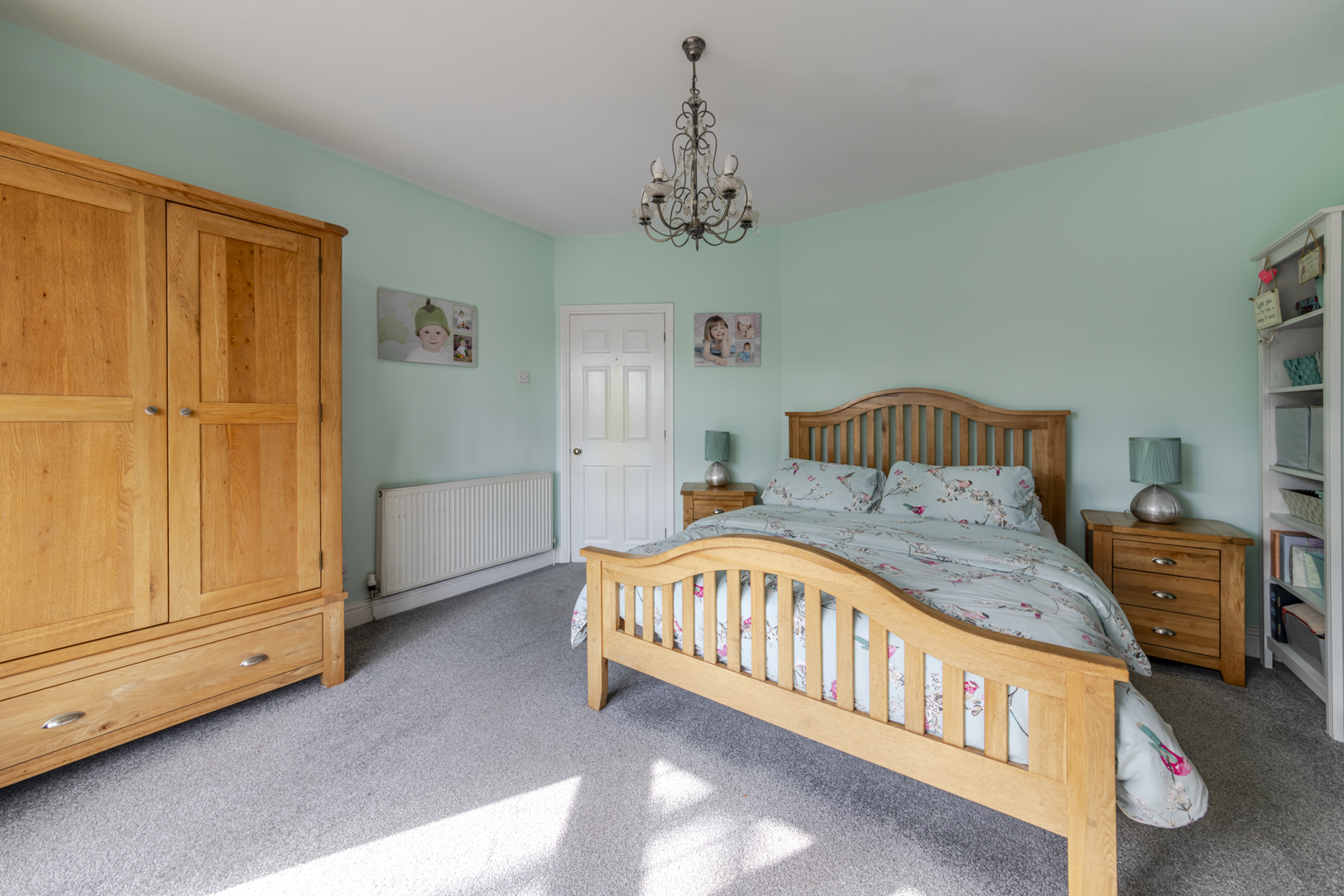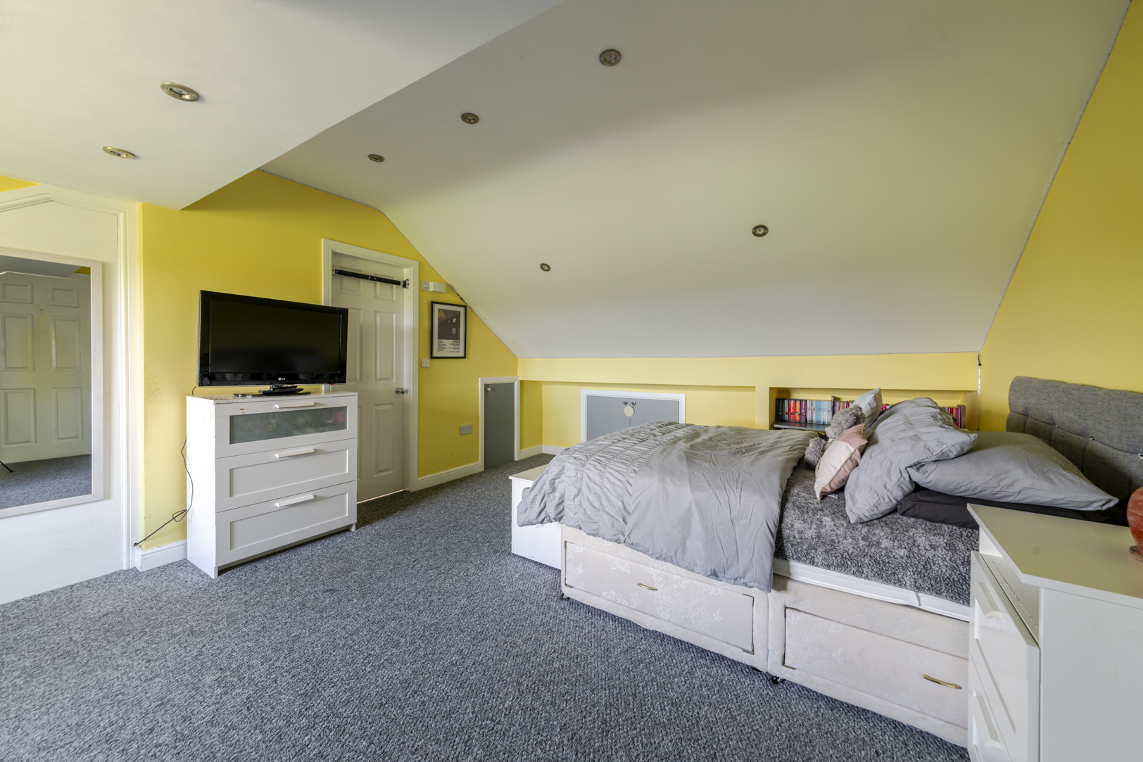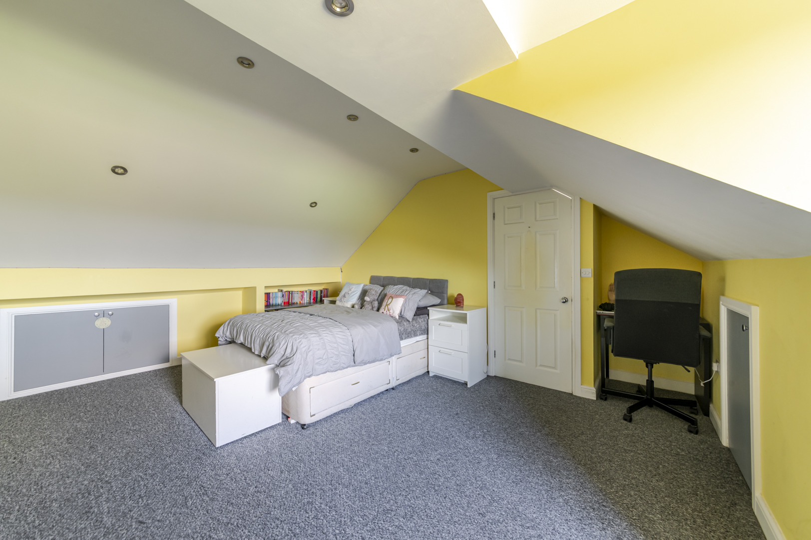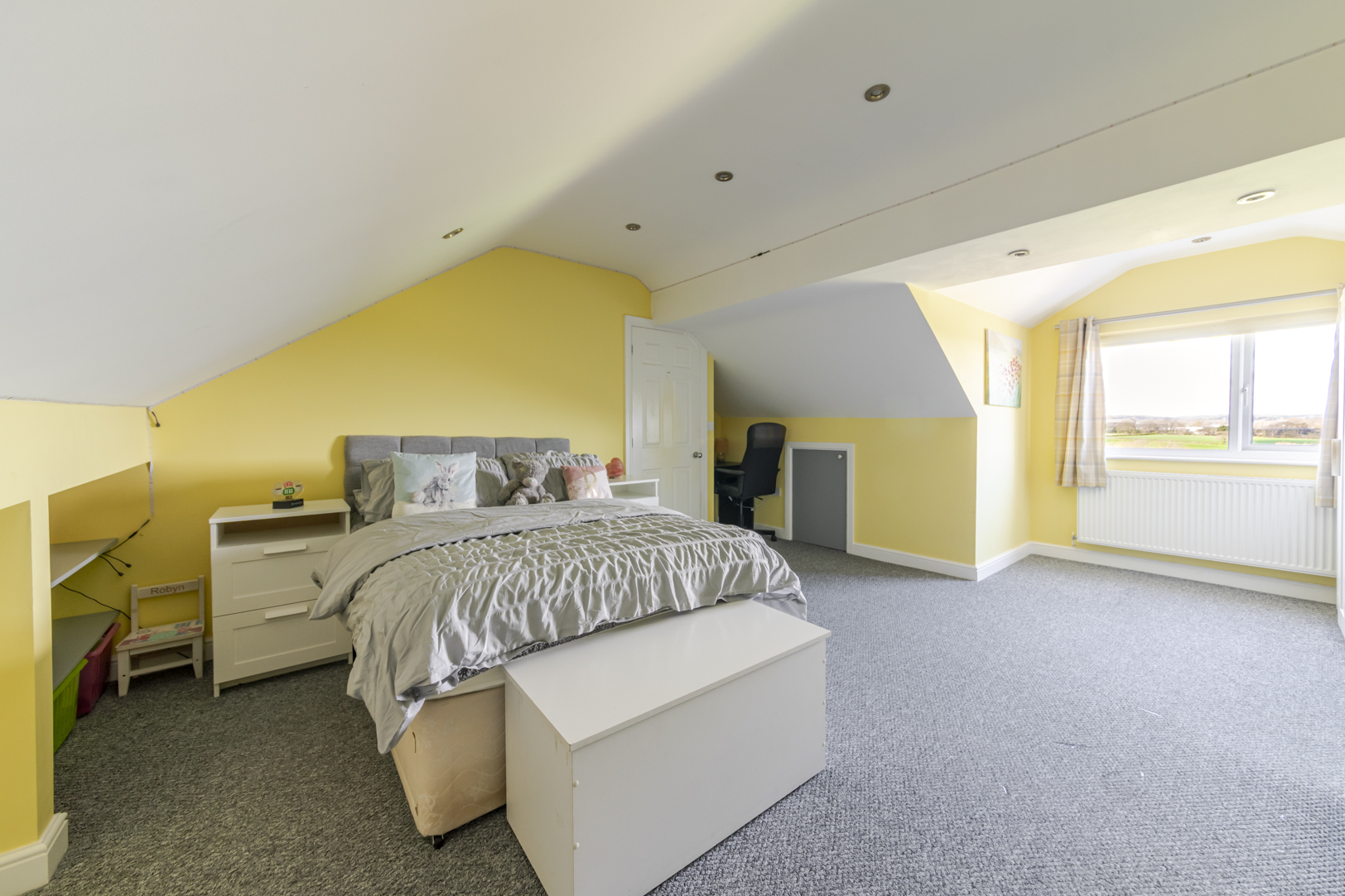 The accommodation continues to the second floor, where a converted loft provides a superb fifth bedroom. This space is particularly generous, complete with eaves storage, elevated views and the added benefit of an en suite—ideal for guests or older family members seeking their own space.