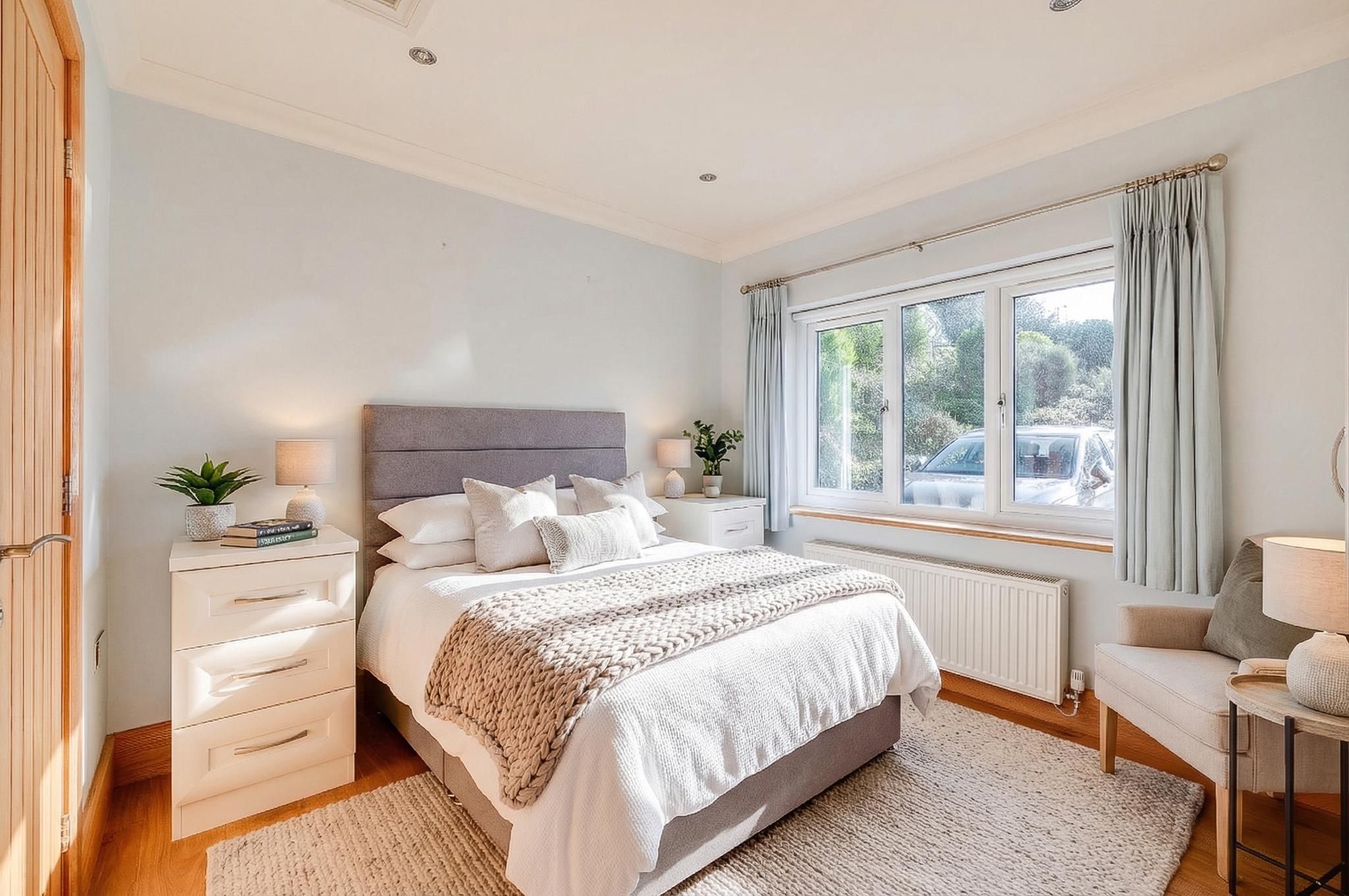 The house offers four spacious bedrooms and three high-quality bathrooms, making it exceptionally well suited to family life or hosting guests in comfort. Each bedroom enjoys its own outlook across the gardens or countryside beyond, reinforcing the strong connection to the setting. Bathrooms are finished to a high standard, combining understated design with everyday practicality.