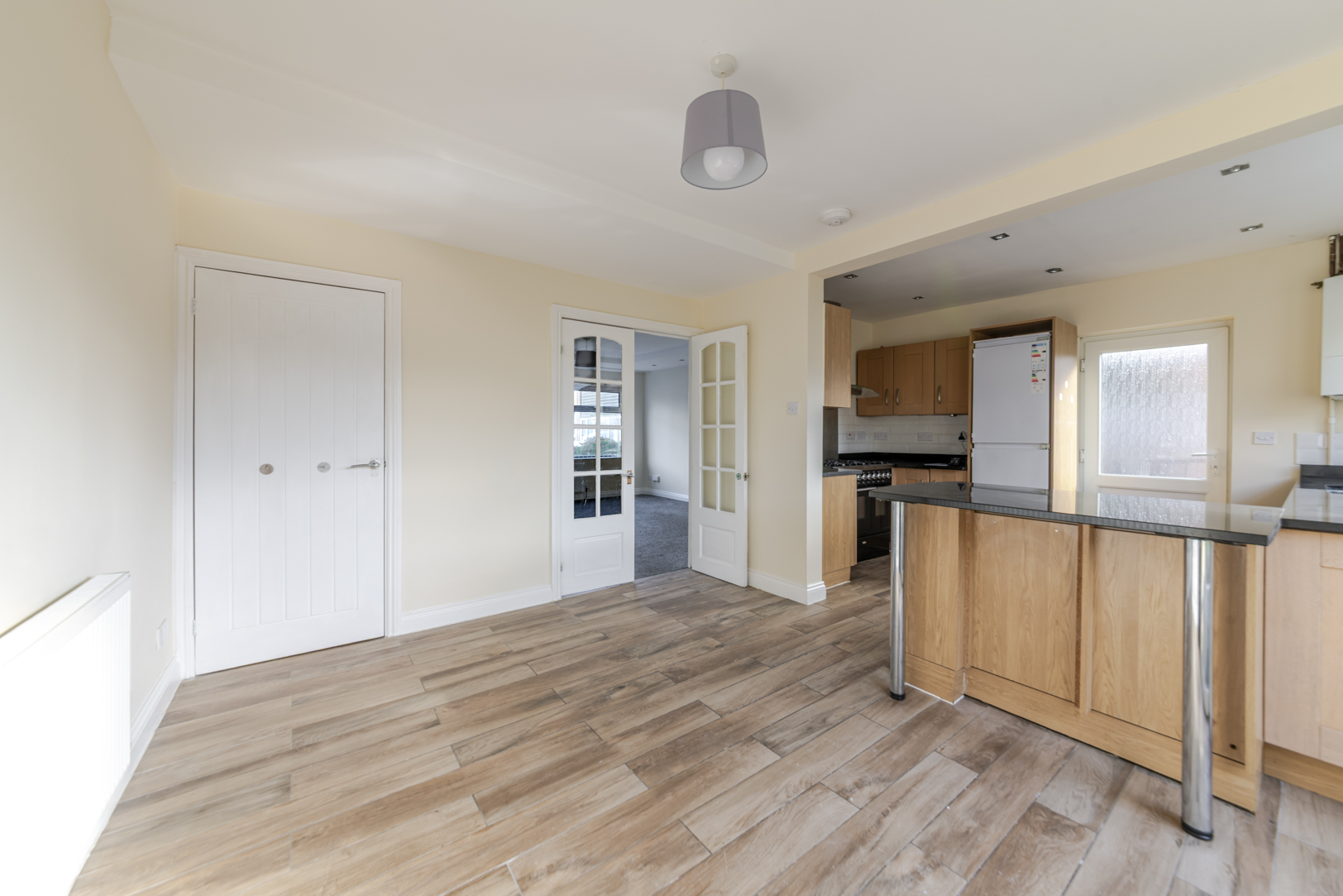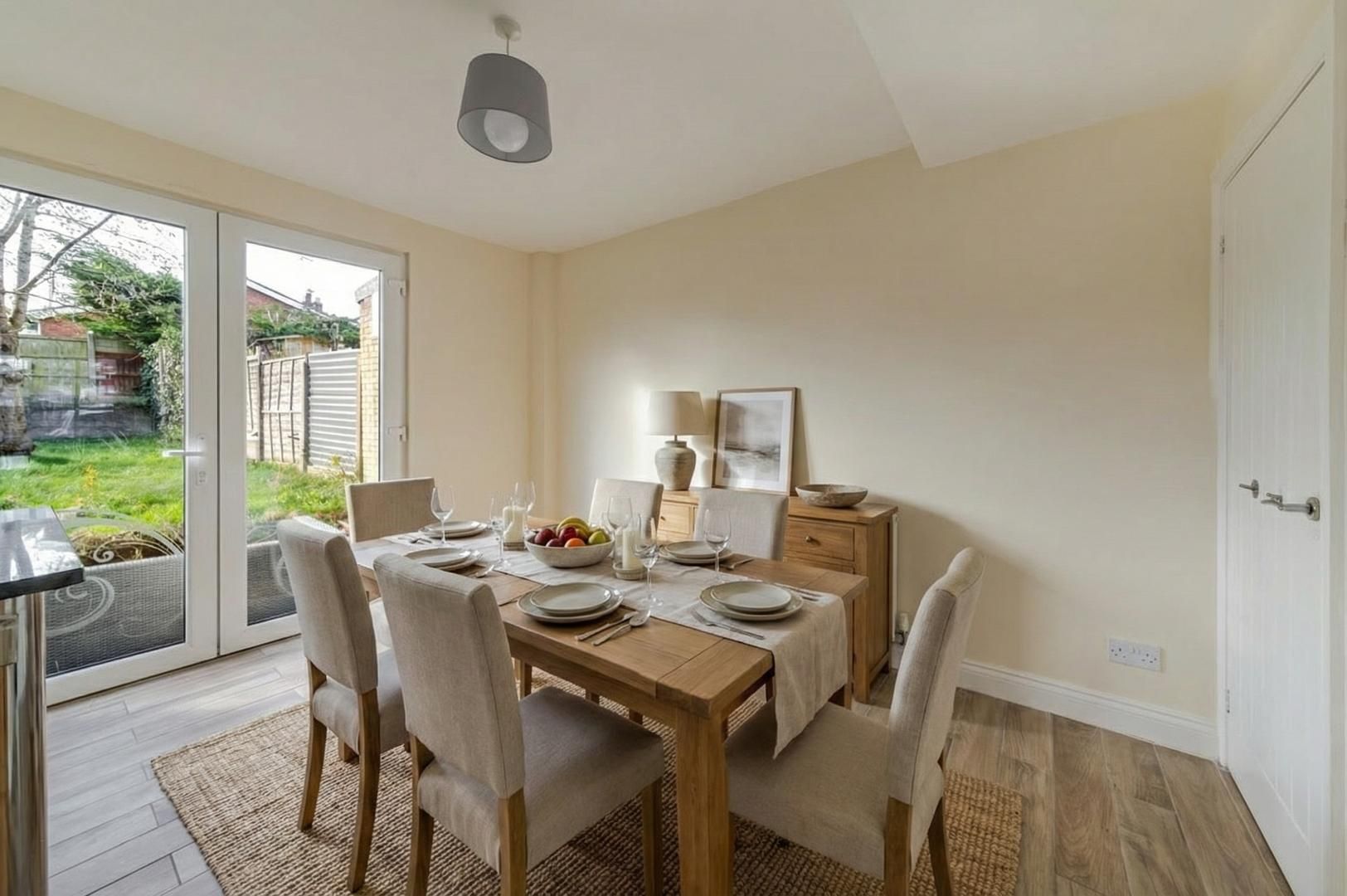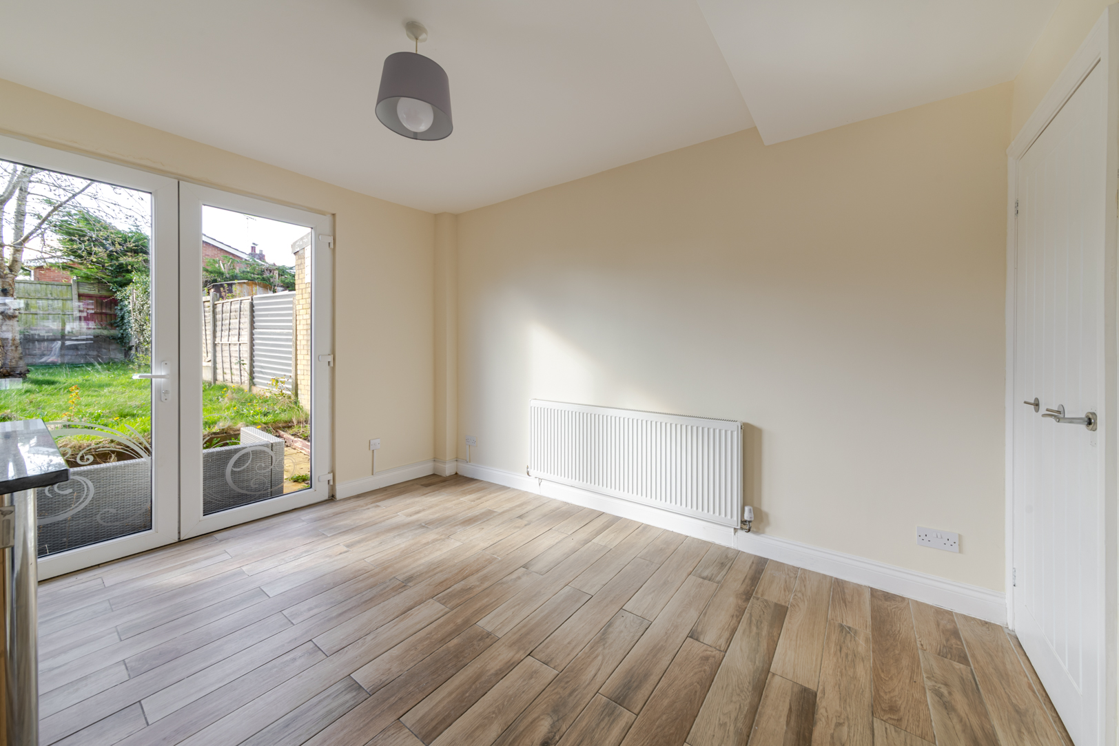 Internally, the property opens into a welcoming hallway which leads through to a bright and spacious living room, enhanced by large windows that allow plenty of natural light to fill the space. Double doors then open into the kitchen and dining area, creating a sociable layout ideal for everyday living. The kitchen offers access to the side of the property, while patio doors from the dining area open onto the rear garden. A useful under stairs storage cupboard adds further practicality.