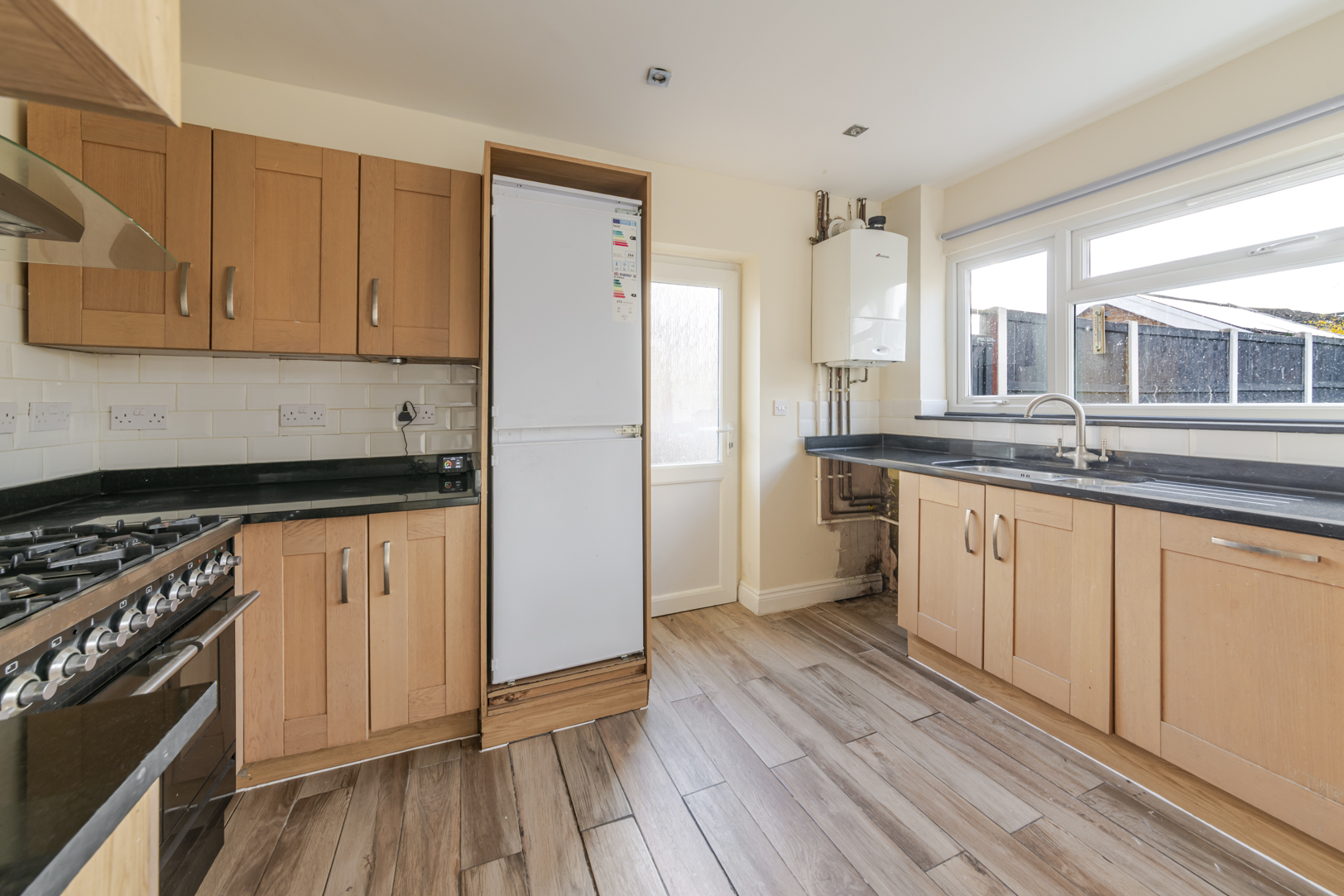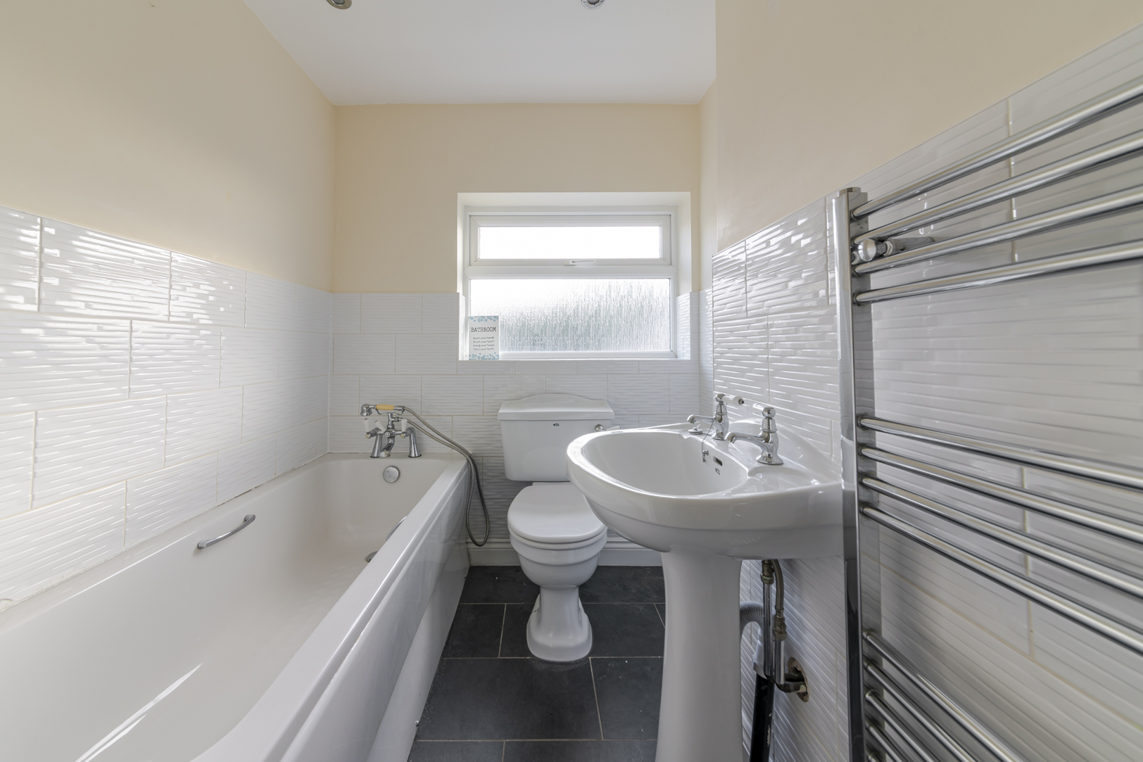 To the first floor are three bedrooms, including a generous principal bedroom with double windows and an en suite shower room. The second bedroom is a comfortable double, while the third bedroom is a particularly good size for its type and includes built in storage. The accommodation is completed by a family bathroom.