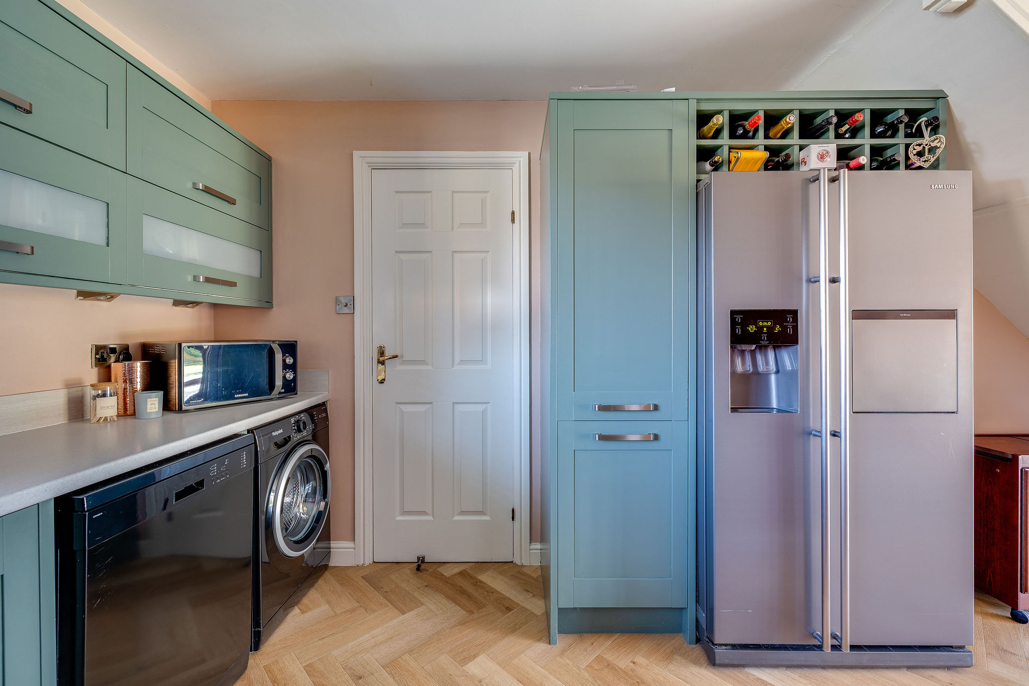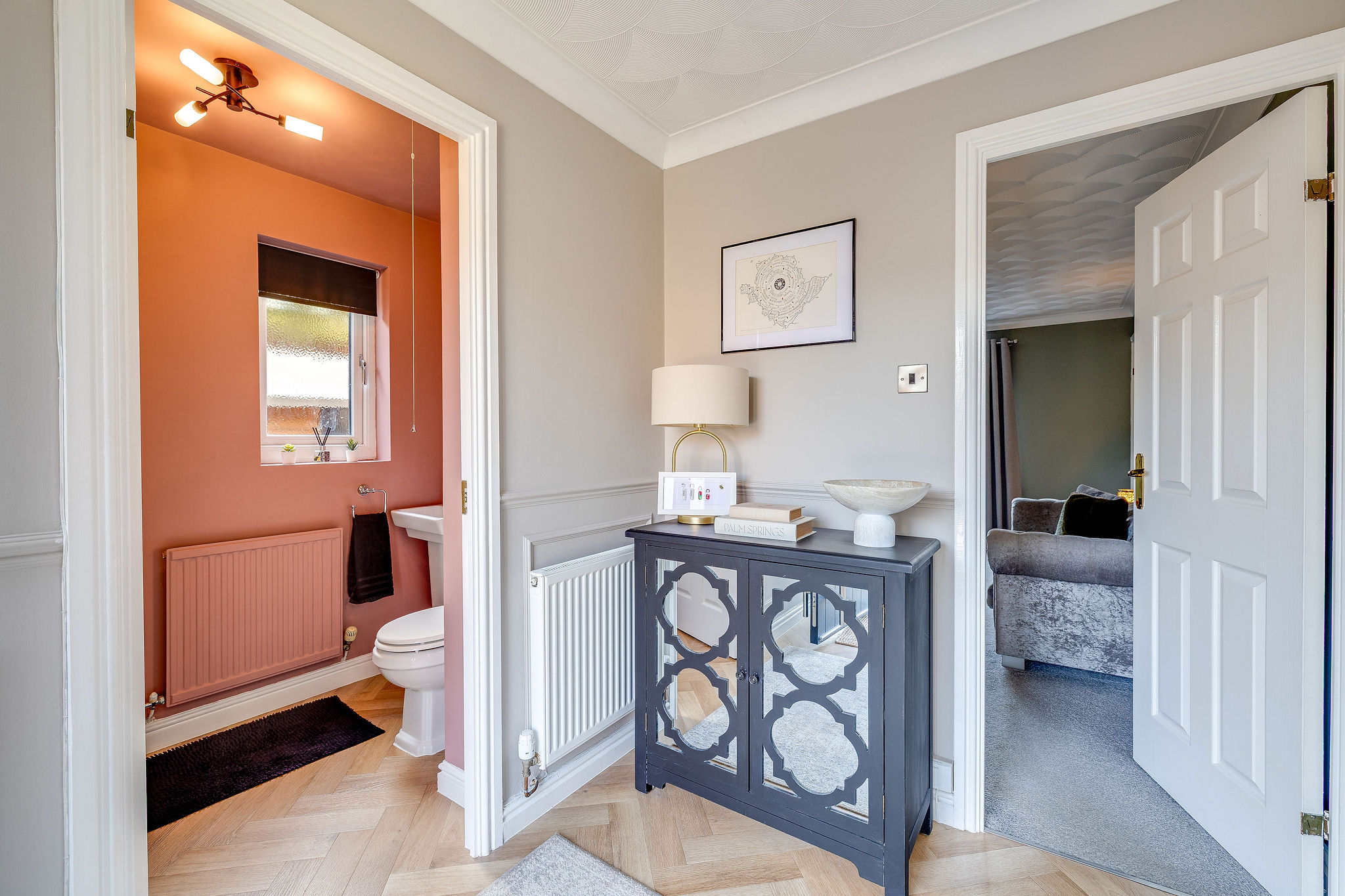 Internally, the property opens into a larger than average entrance hall with attractive wood effect parquet flooring and useful built in storage. A modern ground floor WC and additional cloak storage are positioned just off the hall.