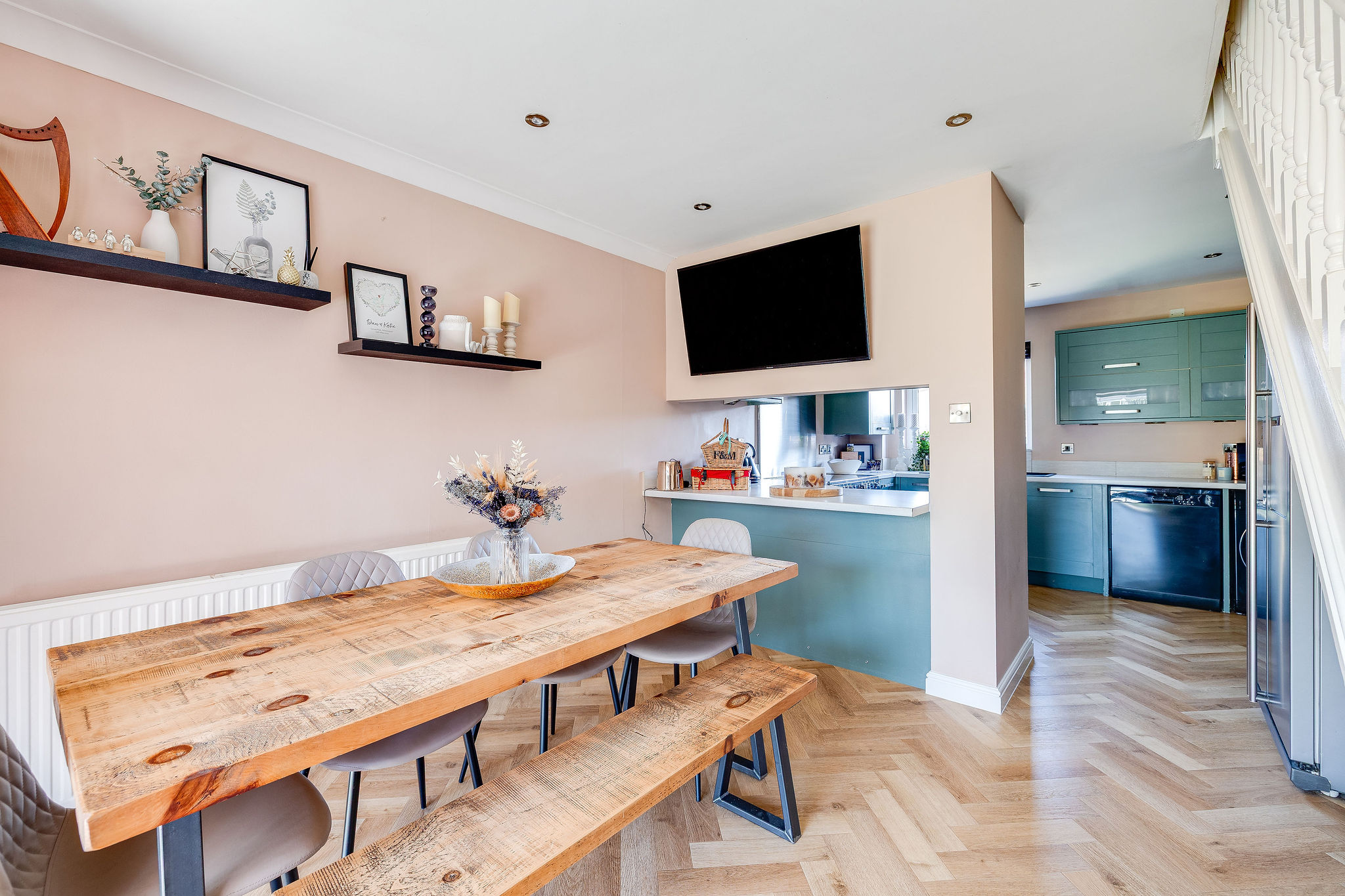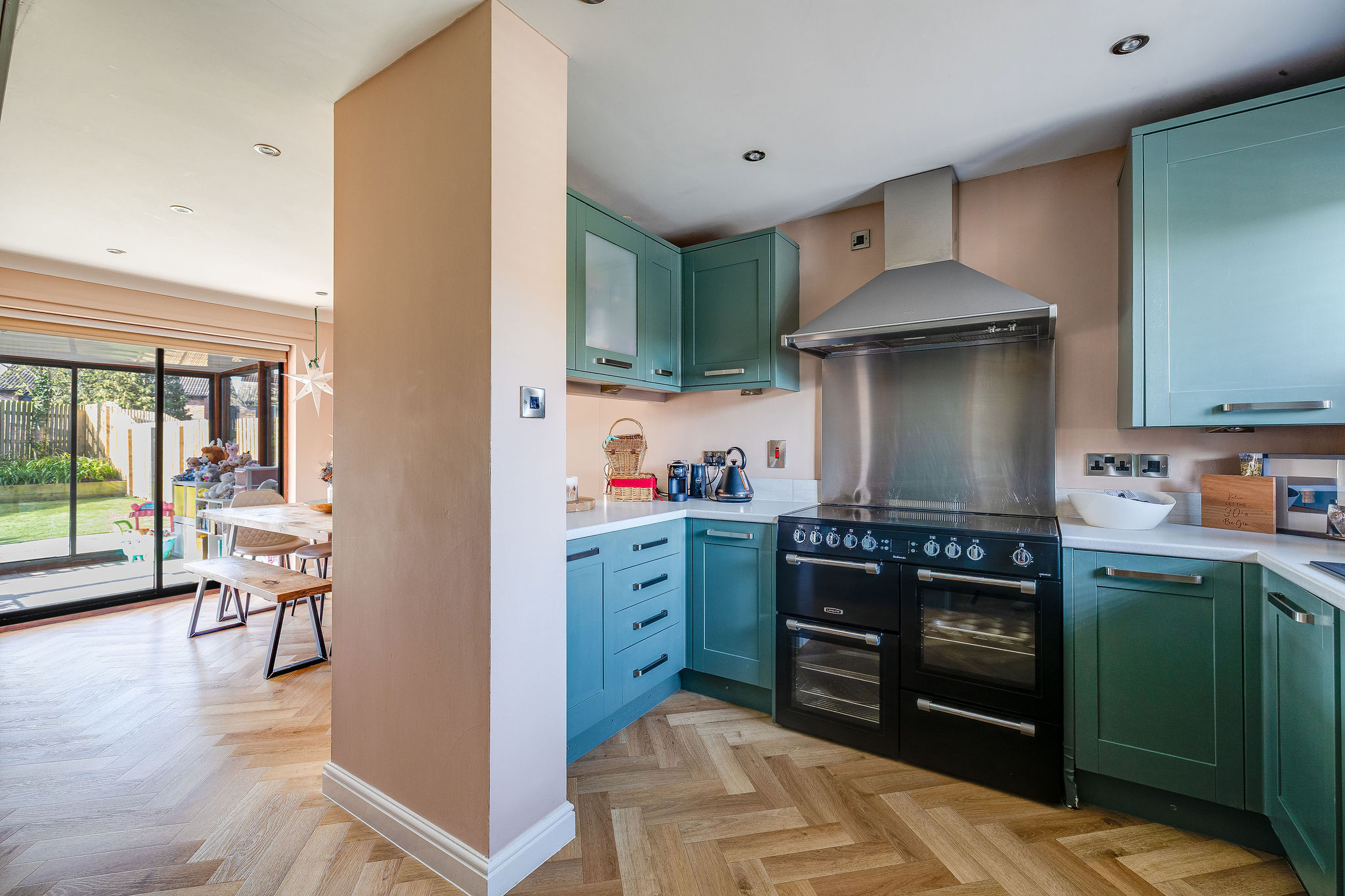 The kitchen and dining area is arranged in an open plan style, creating a sociable and practical family space. The kitchen is fitted with a range of painted timber units and offers space for a range style cooker, American style fridge freezer, dishwasher and washing machine. A breakfast bar provides informal seating, while the adjoining dining area offers plenty of space for family meals and entertaining. Sliding doors lead through to the conservatory, which has a fixed roof and is currently used as a playroom, making it a highly flexible additional reception space.