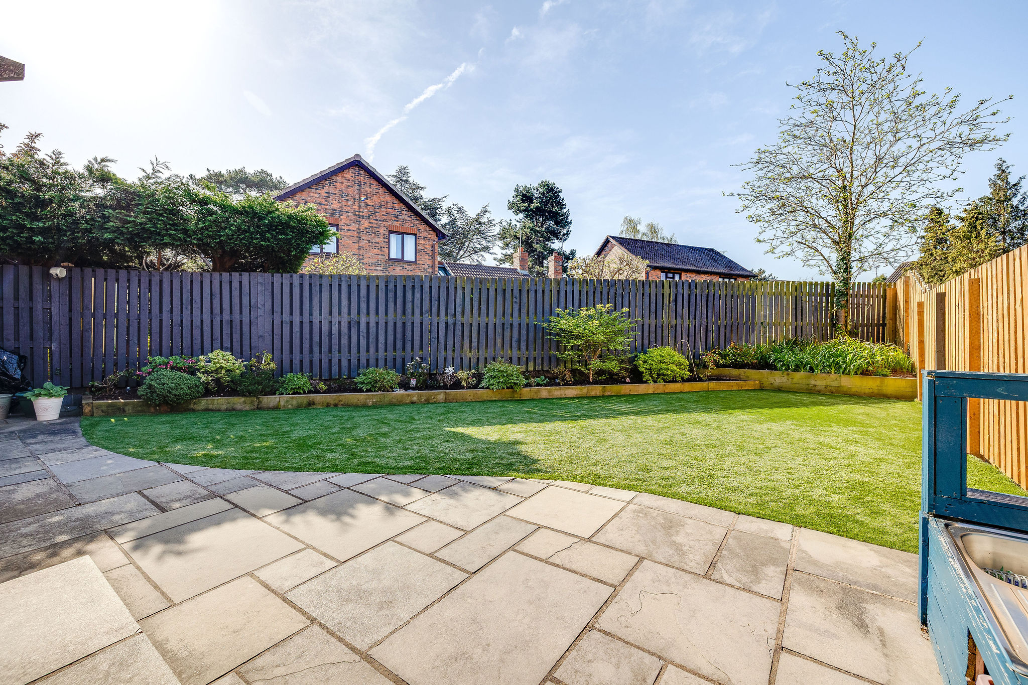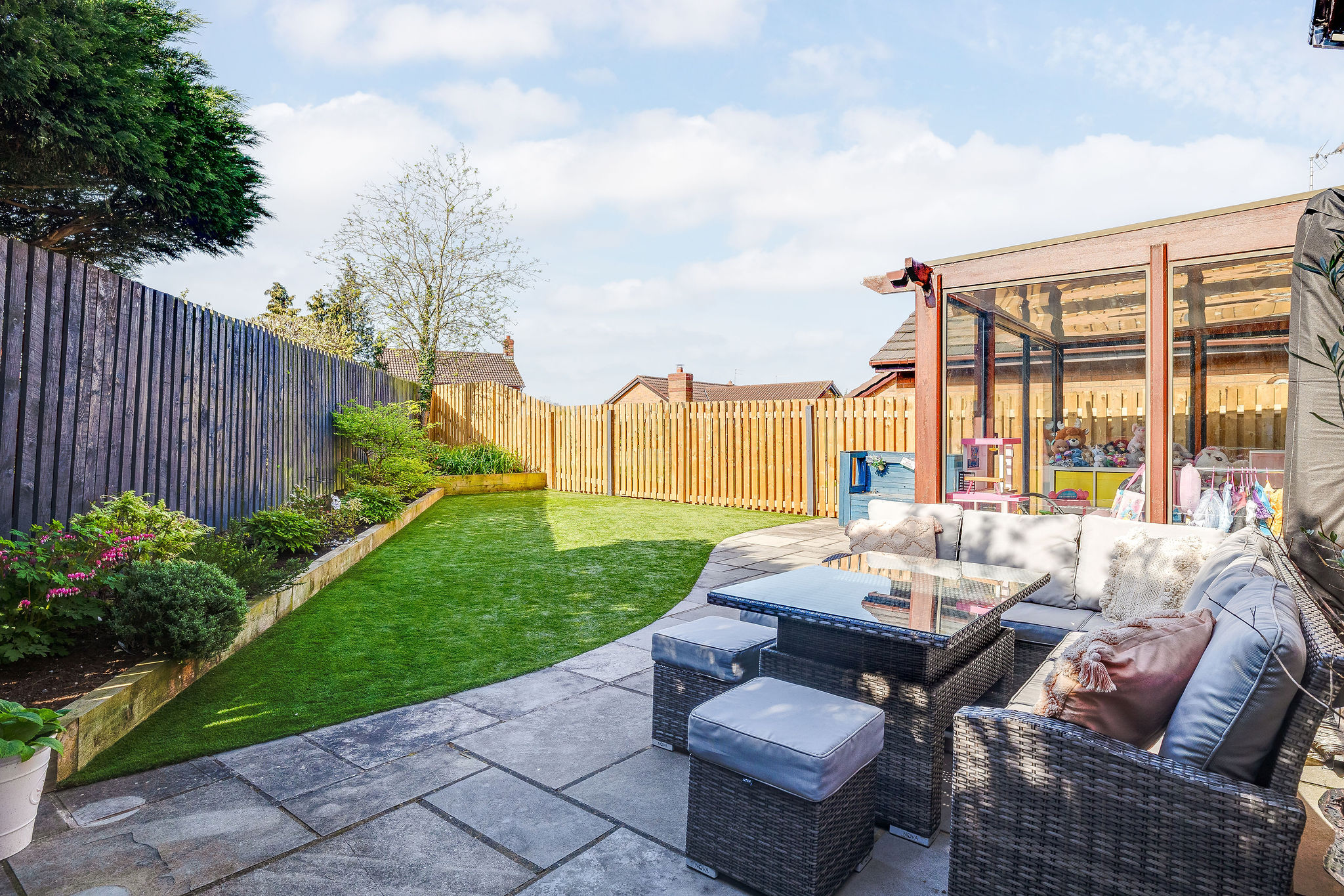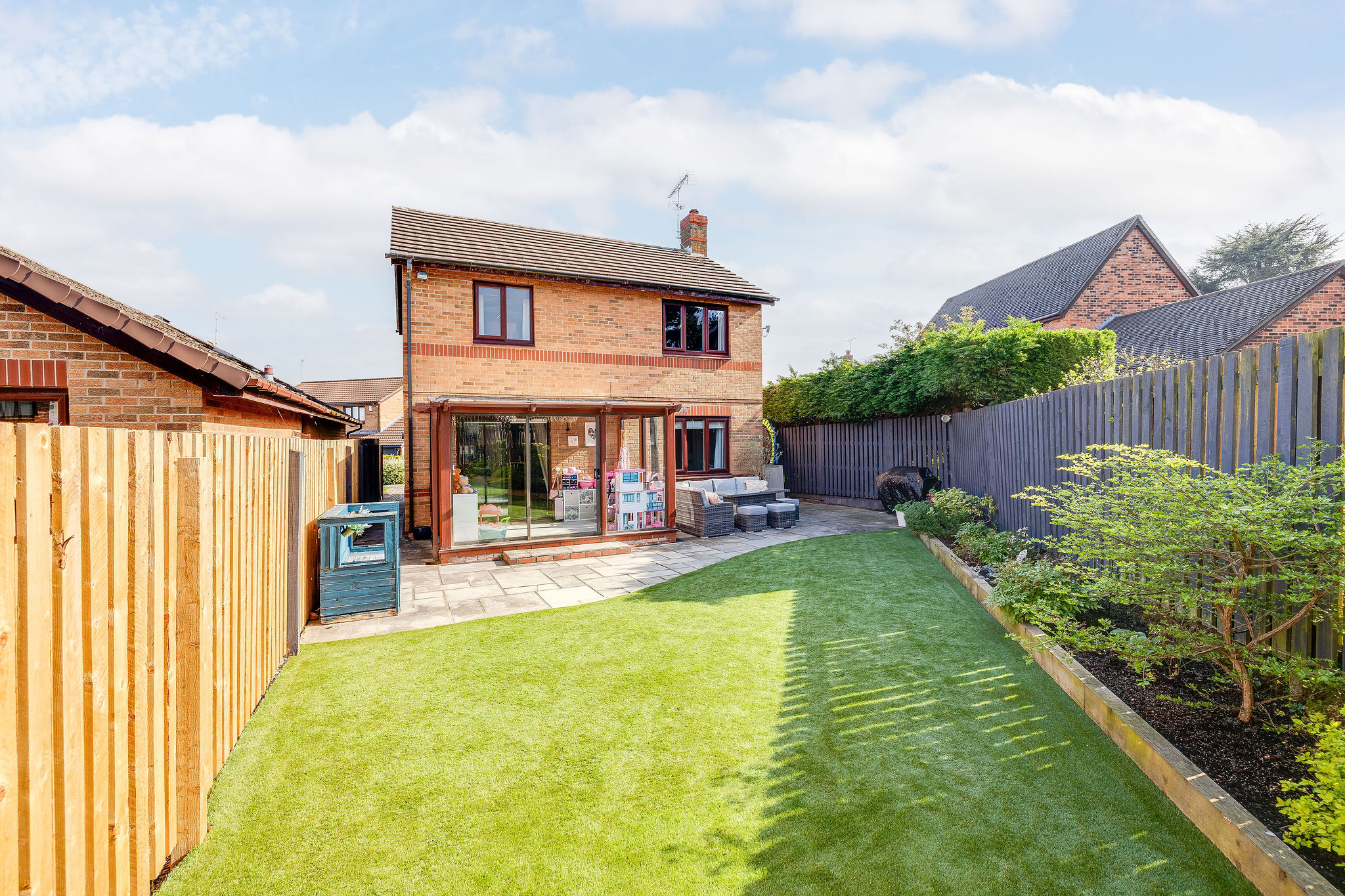 The rear garden is a real highlight, enjoying a sunny southerly aspect and designed for ease of maintenance. With paved seating areas, artificial lawn, raised borders and established planting, it offers a perfect balance of outdoor enjoyment and practicality.