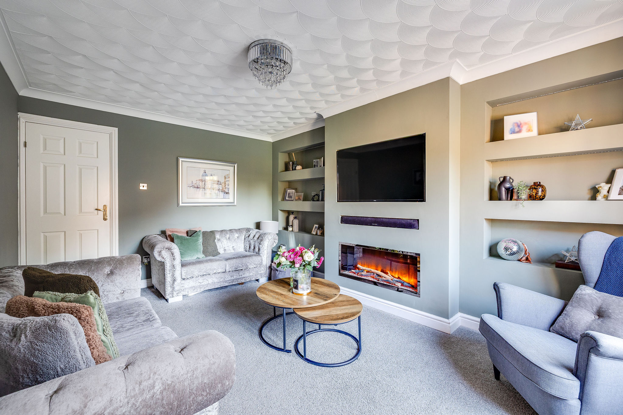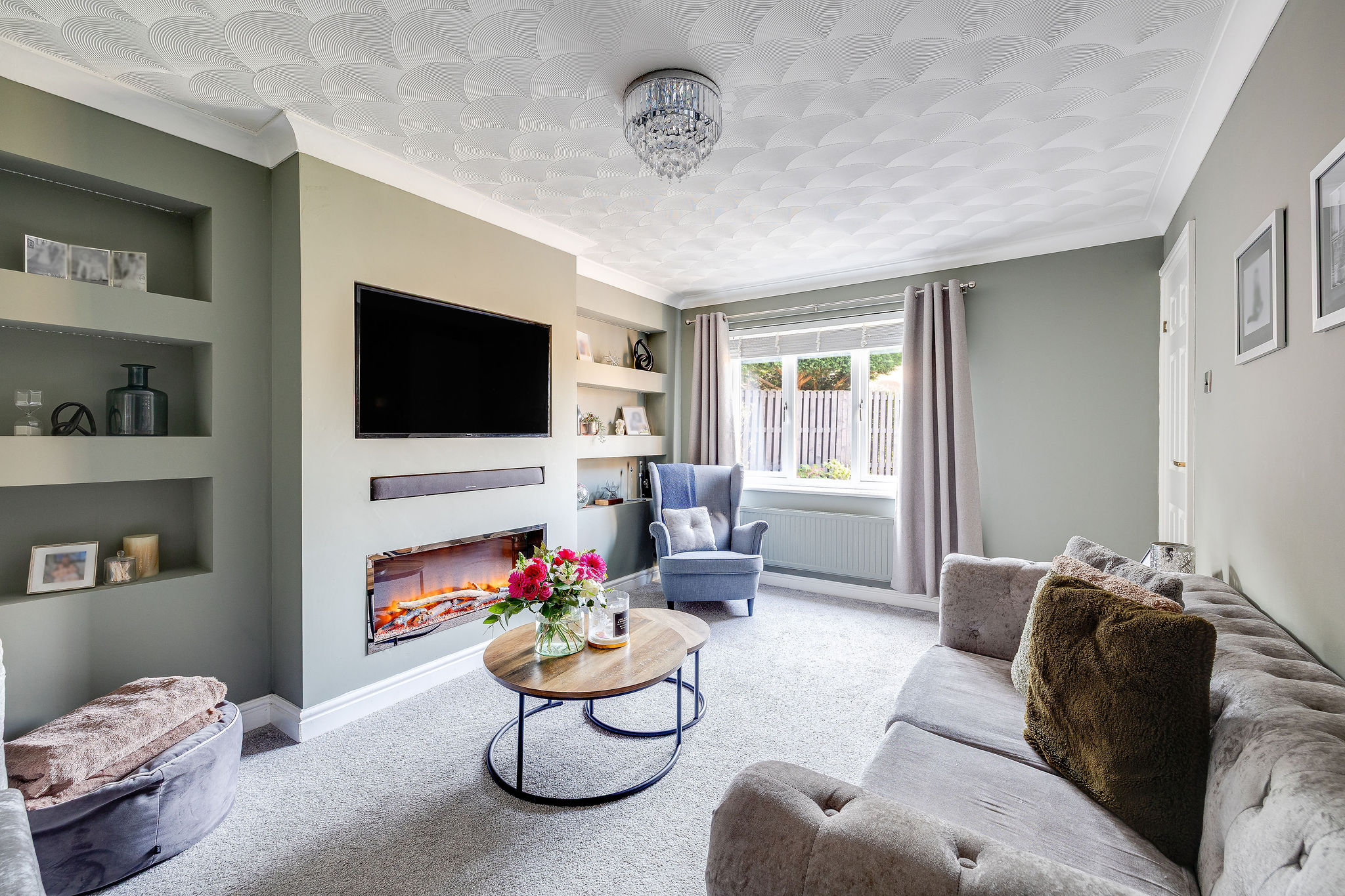 The living room is a stylish and comfortable space, centred around a contemporary media wall with inset electric fire and display shelving. A large window overlooks the rear garden, while the neutral décor gives the room a bright and welcoming feel.