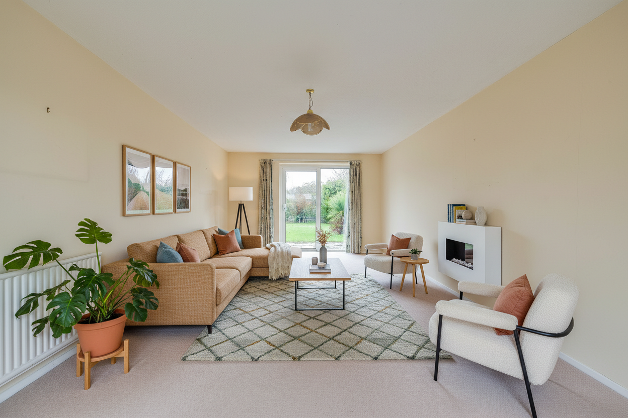 - Living room the full length of the property with a large window and the front and sliding doors at the back, very bright room.