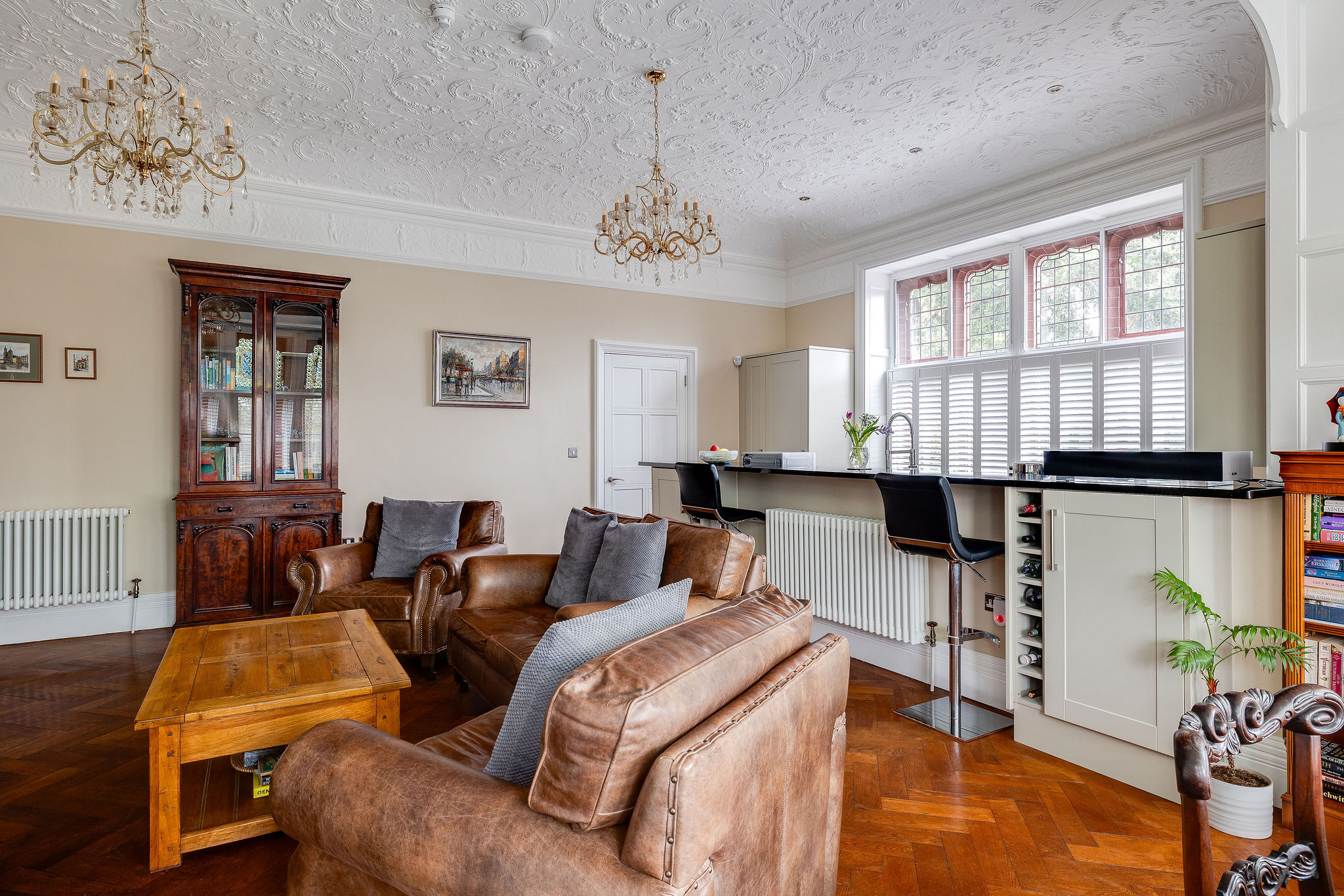 The apartment showcases stunning architectural details throughout, including high ceilings, intricate cornicing, stained glass windows and elegant proportions that reflect the building’s rich history. These features are complemented by stylish modern finishes, creating a unique and inviting living space.