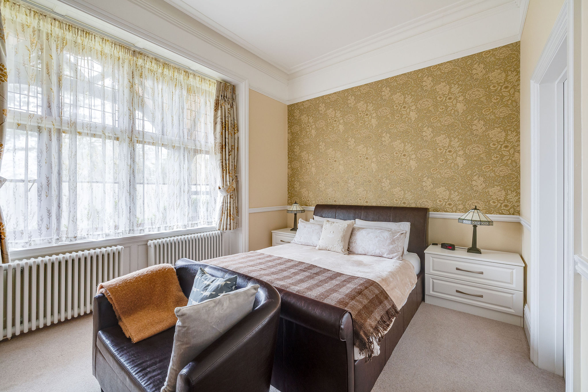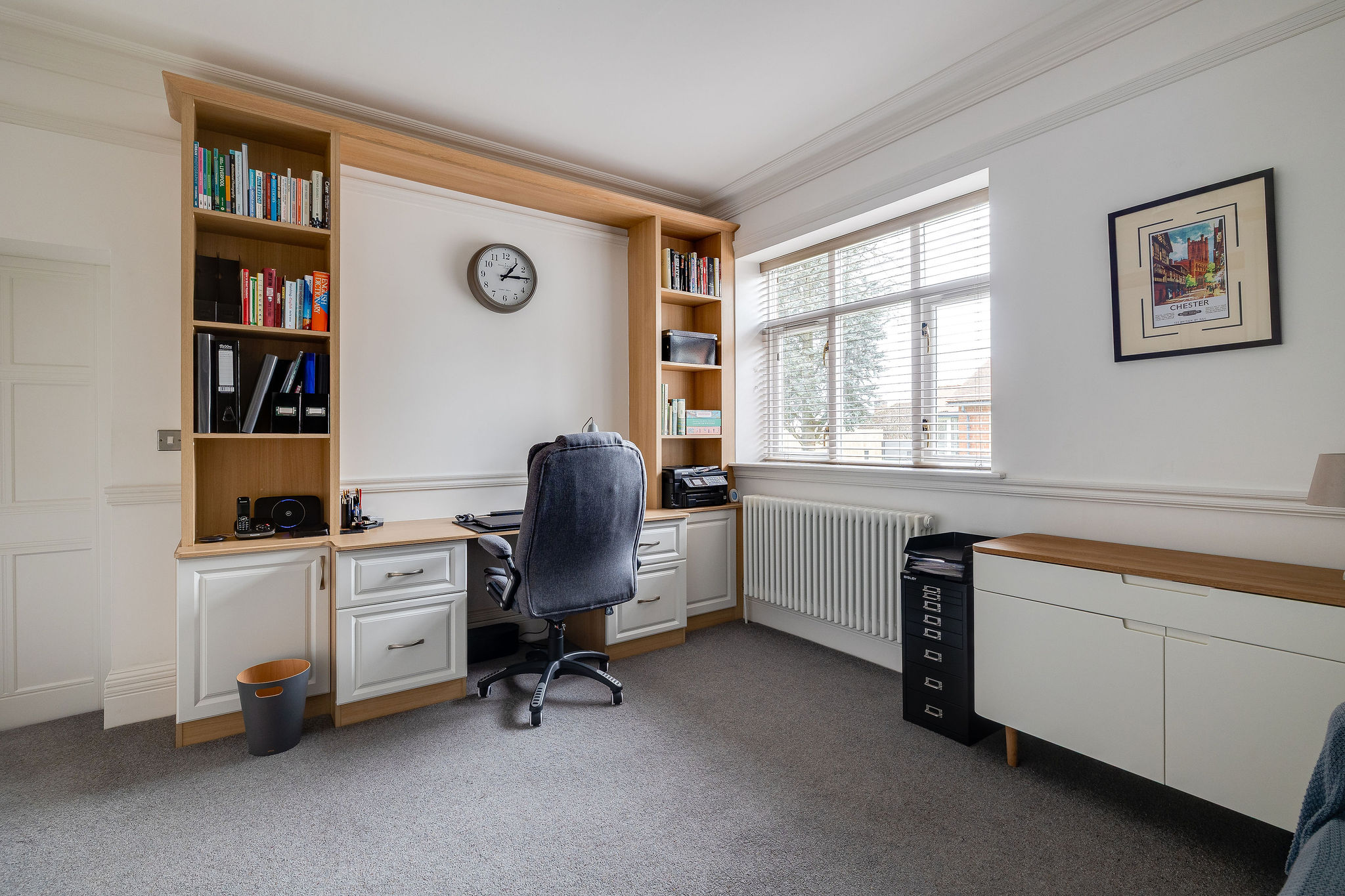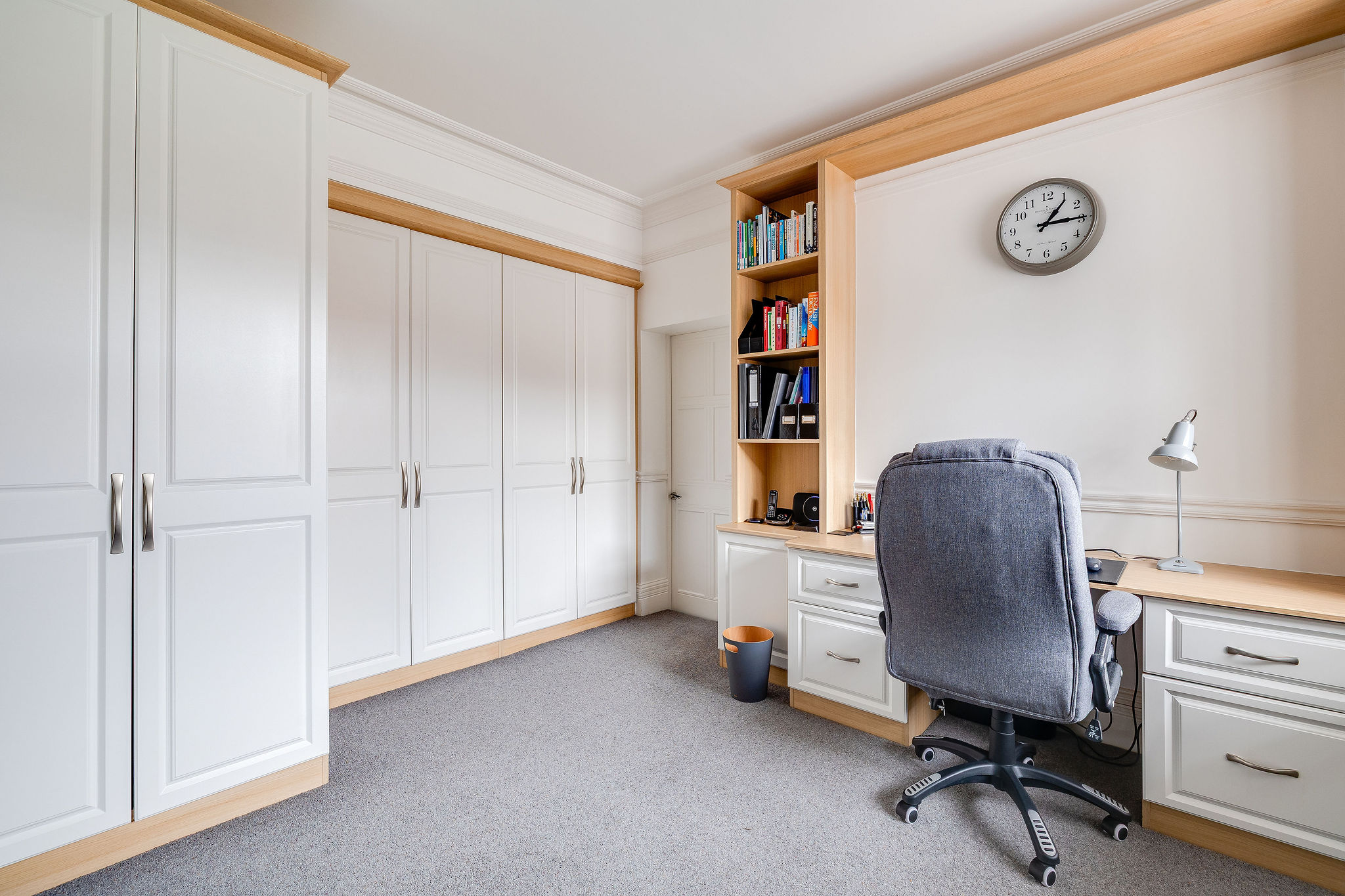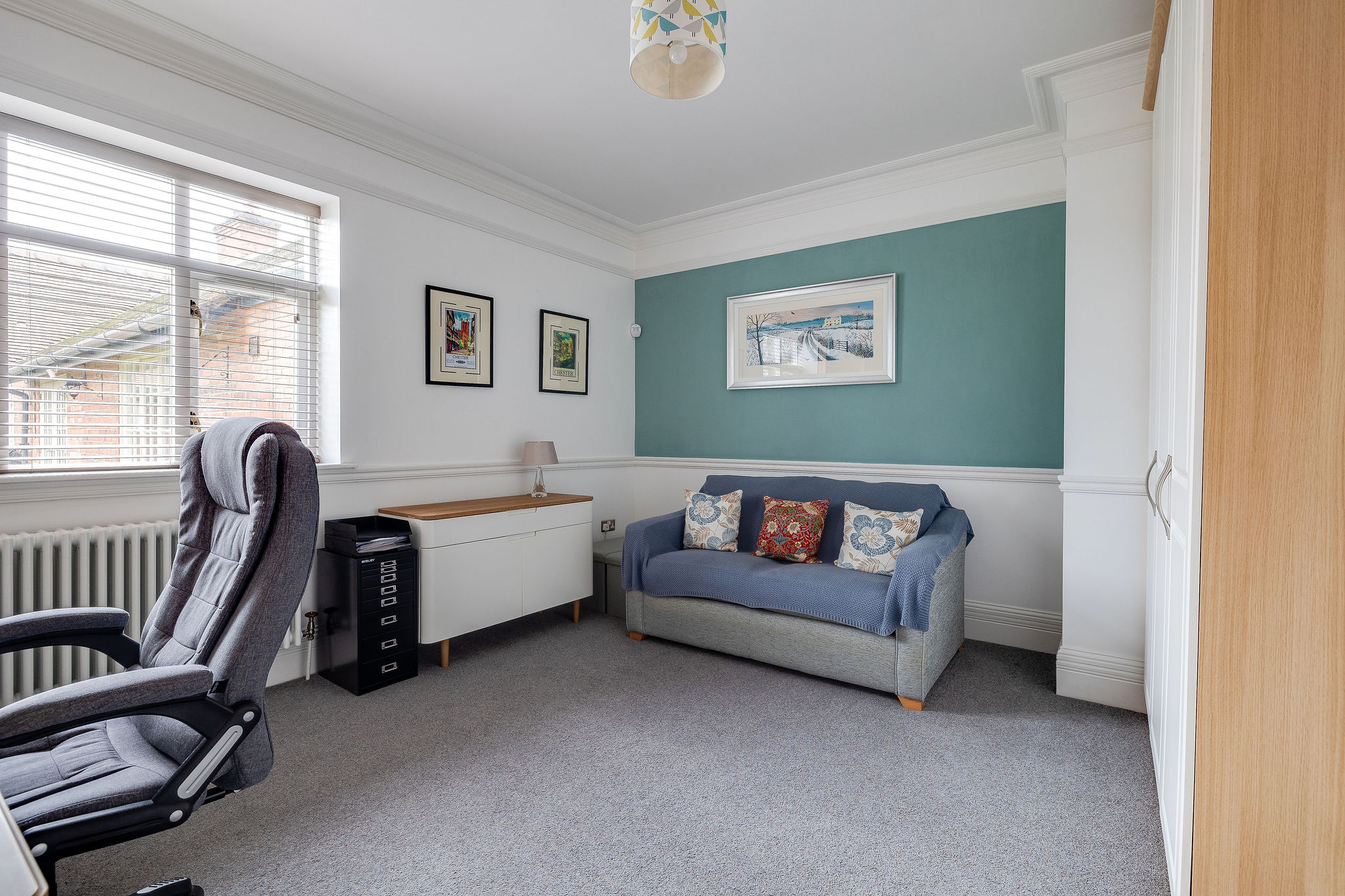 The principal bedroom is generously sized and enjoys attractive views, along with the benefit of a private en suite shower room. A second double bedroom offers flexible use and is currently arranged as a home office, providing an ideal space for remote working or guest accommodation.